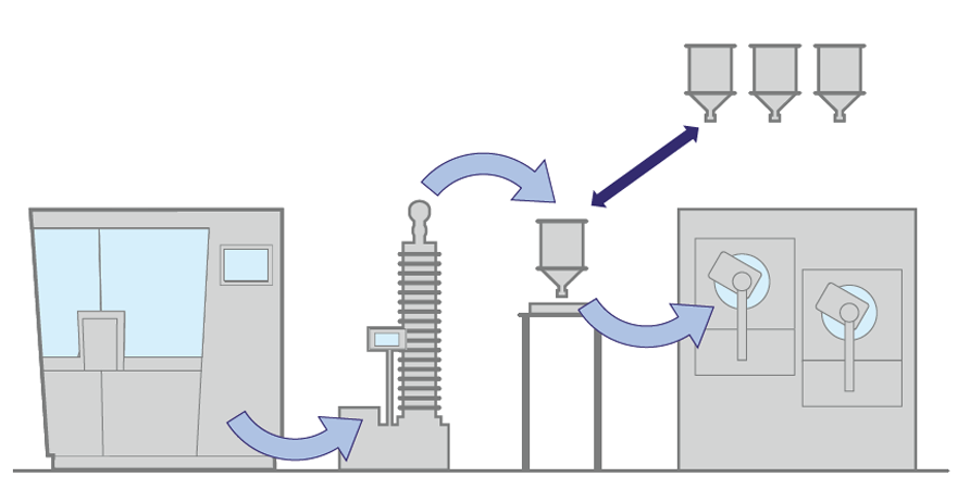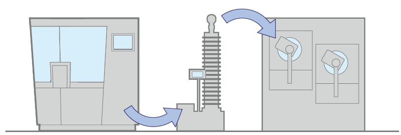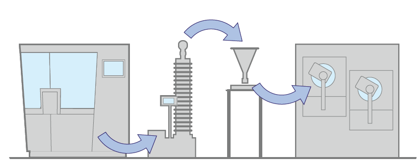 When the relaxation time is in the order of minutes, this second configuration becomes the best choice. In this case, the buffer is used for helping the tablets to reach the stability condition. The buffer can also compensate the stop condition of one machine – for example it is possible to keep the coater running while the tablet press is in stand-by for limited period.