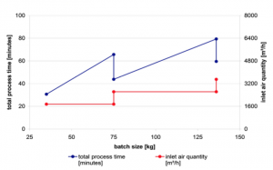 - Independent from scale, the ratio of spray rate to inlet air volume is responsible for the surface quality. Using this parameter scale-up calculation can be easily done.