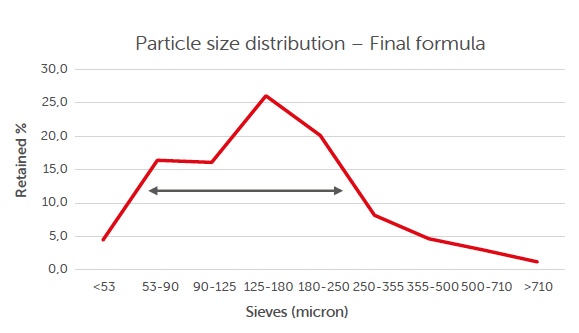 Once added, the blend had to be dried in the Roto Cube using vacuum to reach good product flowability. Due to particle agglomeration, the peeling effect was still present. Consequently, so as not to complicate the process, it was finally decided to use a surfactant in powder form with a suitable particle size.