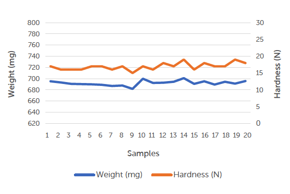 Graph 2: weight and hardness of collected samples of shampoo tablets.