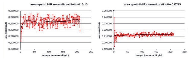 Normalized NIR spectra area for batches 015/13 and 017/13
