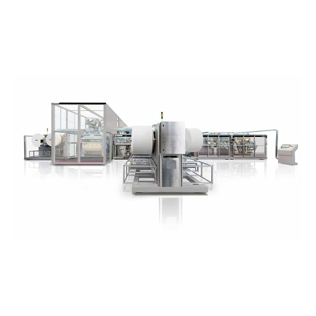 A complete line, from converting to packaging, to produce the thinnest absorbent mats and underpads, packed in pre-formed bags.