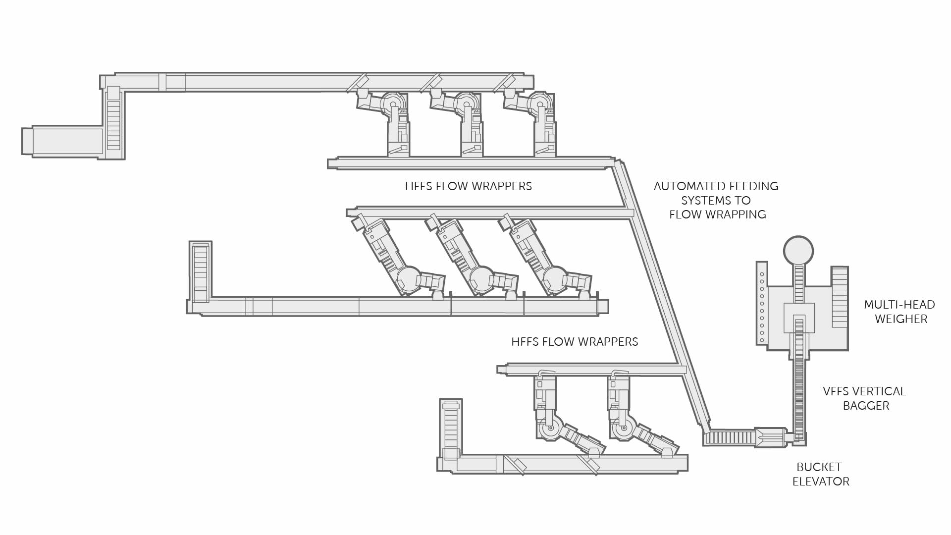 Fully automated packaging line for jellies consisting of HFFS high-speed flow wrapping system for single flow packs, multi-head weigher and VFFS vertical bagging for multi-packs in Quad seals bags.