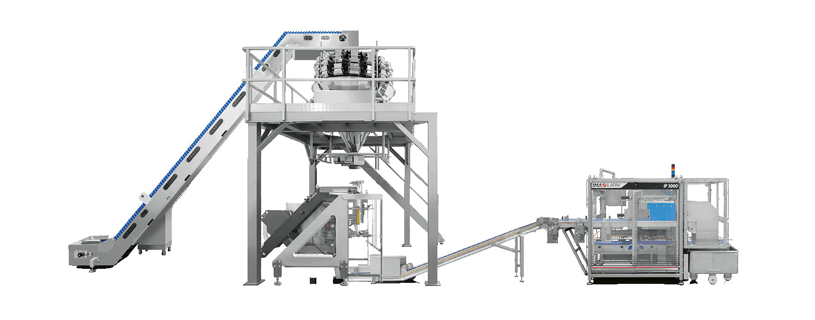 Featuring feeding systems, the WA PRO 12-50 multi-head weigher, the Vegatronic 2000 ML vertical bagger, and the IP 3000 case packer, this integrated solution ensures seamless processing from product weighing to final secondary packaging.