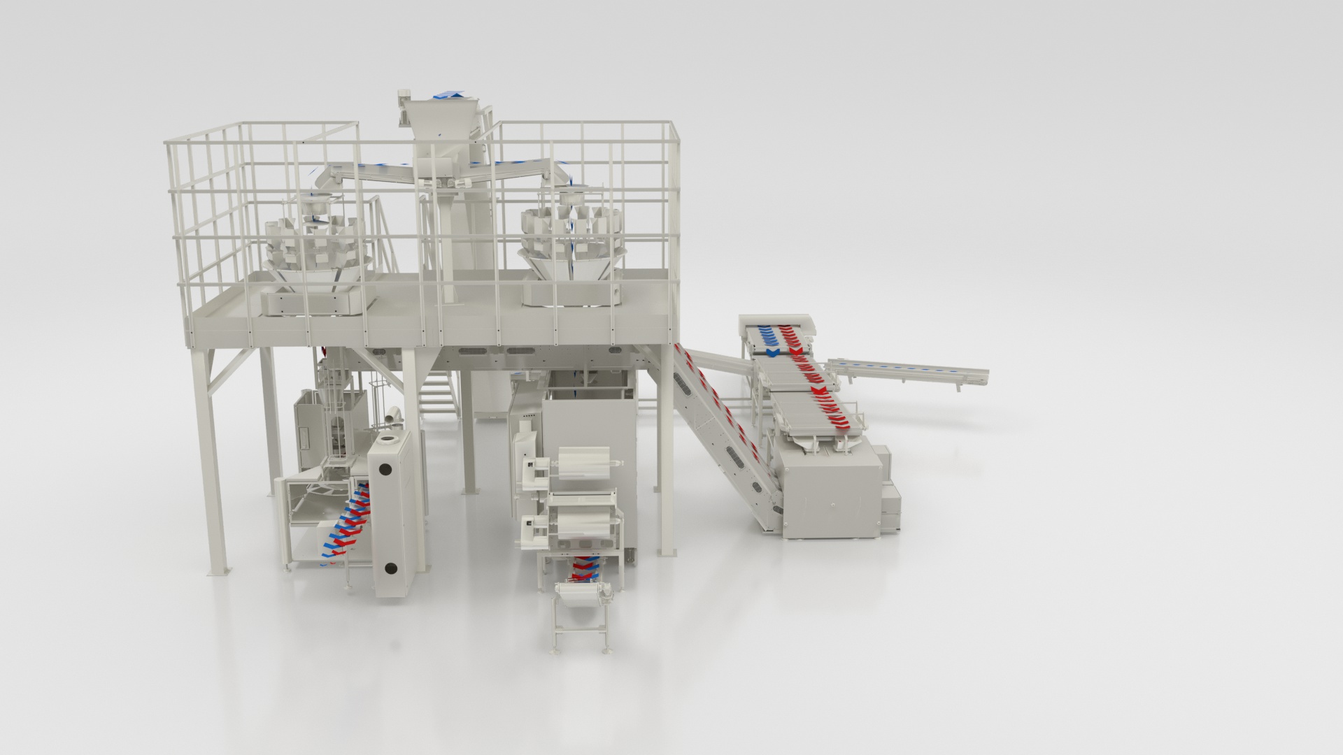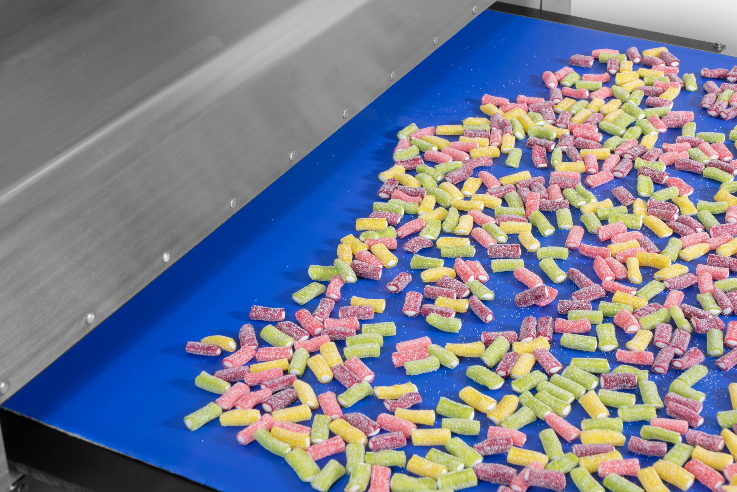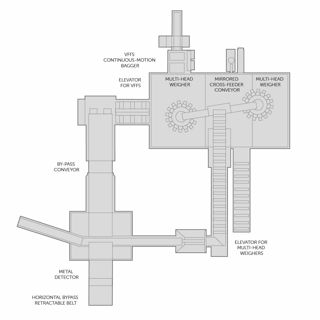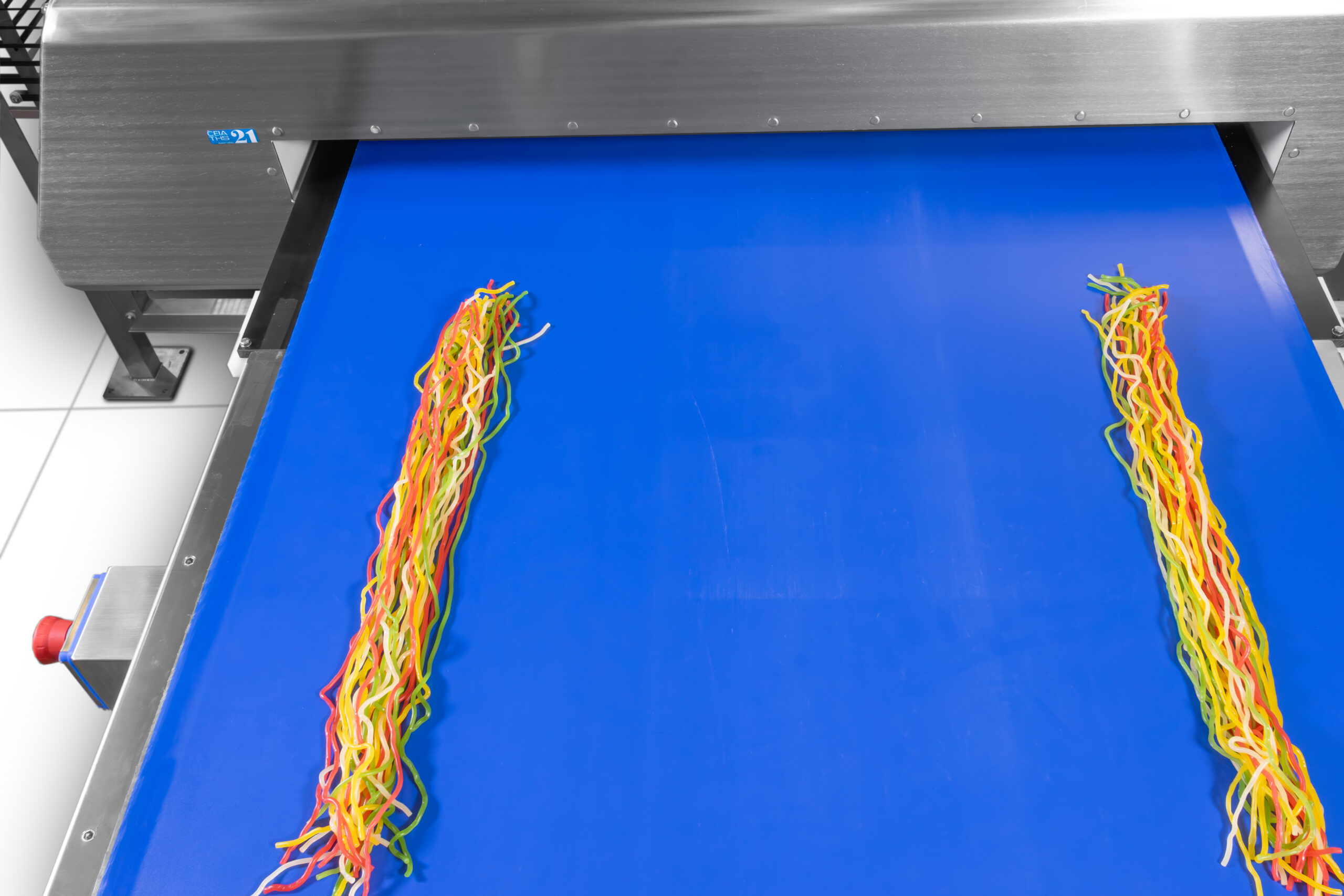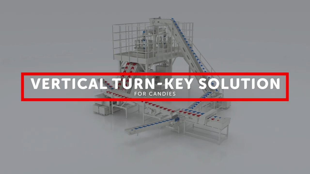 Complete vertical packaging line for candies, from extruder to handling and nesting systems (for small and long candies in various modes), as well as feeding, weighing, and primary packaging.