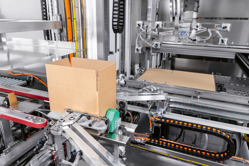 Multi-size case erecting and closing line for FEFCO 201 XL boxes