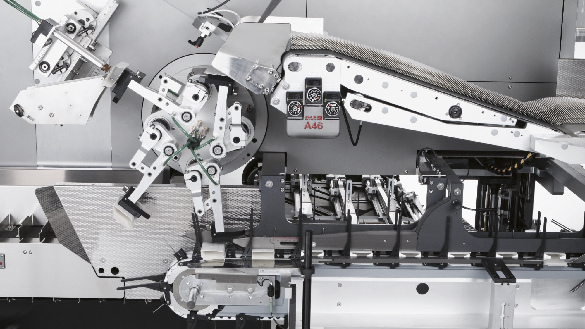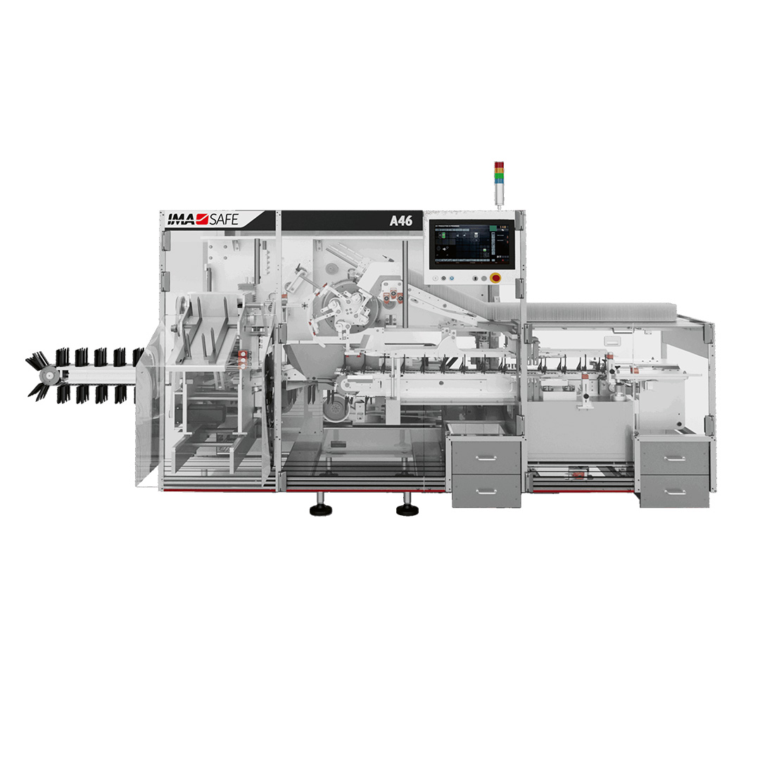A46 can be integrated with IMA blister machines and deep draw thermoformers providing a compact monobloc solution. As a stand-alone version, it enables flexible line composition thanks to its compatibility with any upstream machine type, such as flow pack and wallet machines, tube fillers, sachet/stick pack machines, bottle fillers, etc.