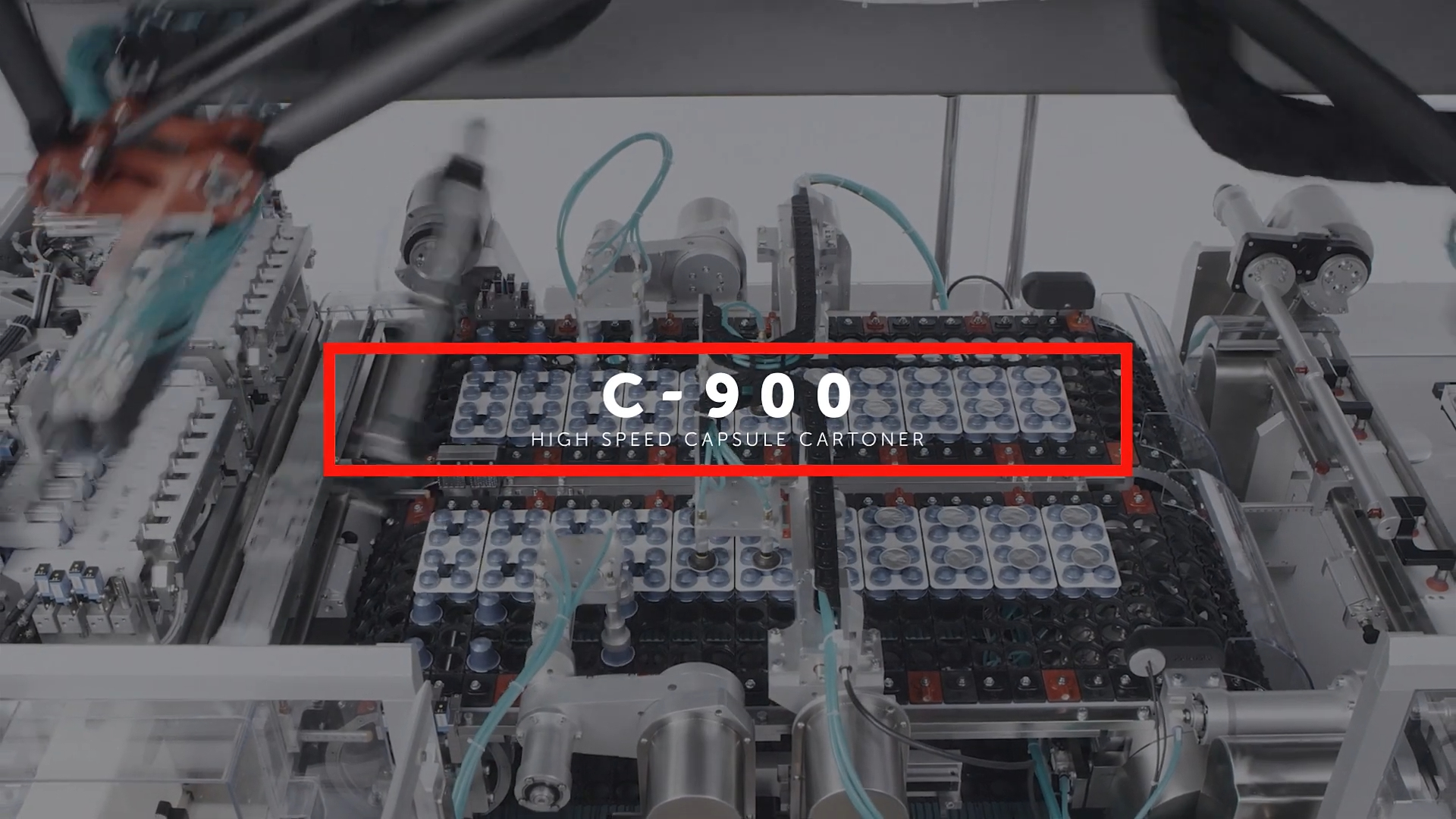 A simple size changeover allows the C-900 to handle any capsule type available on the market in any arrangement and carton style. The machine can feed up to 900 capsules per minute and pack up to 90 cartons per minute.