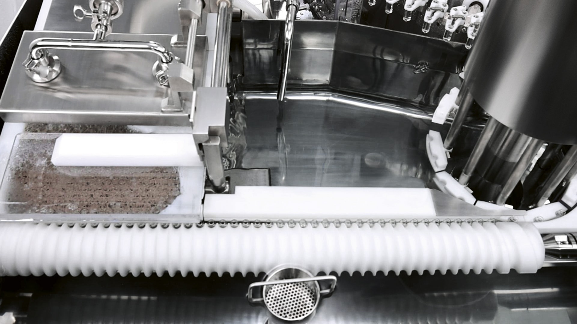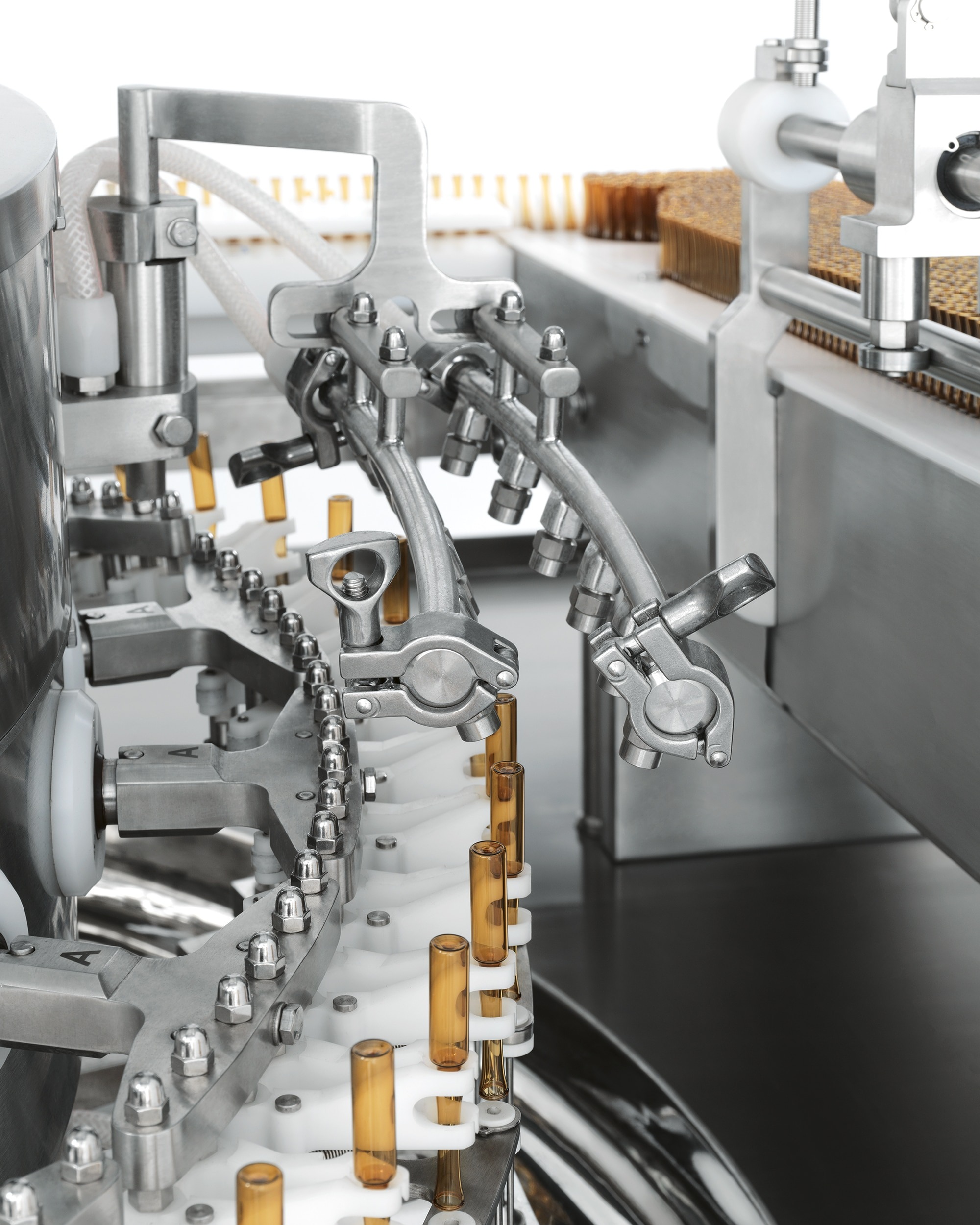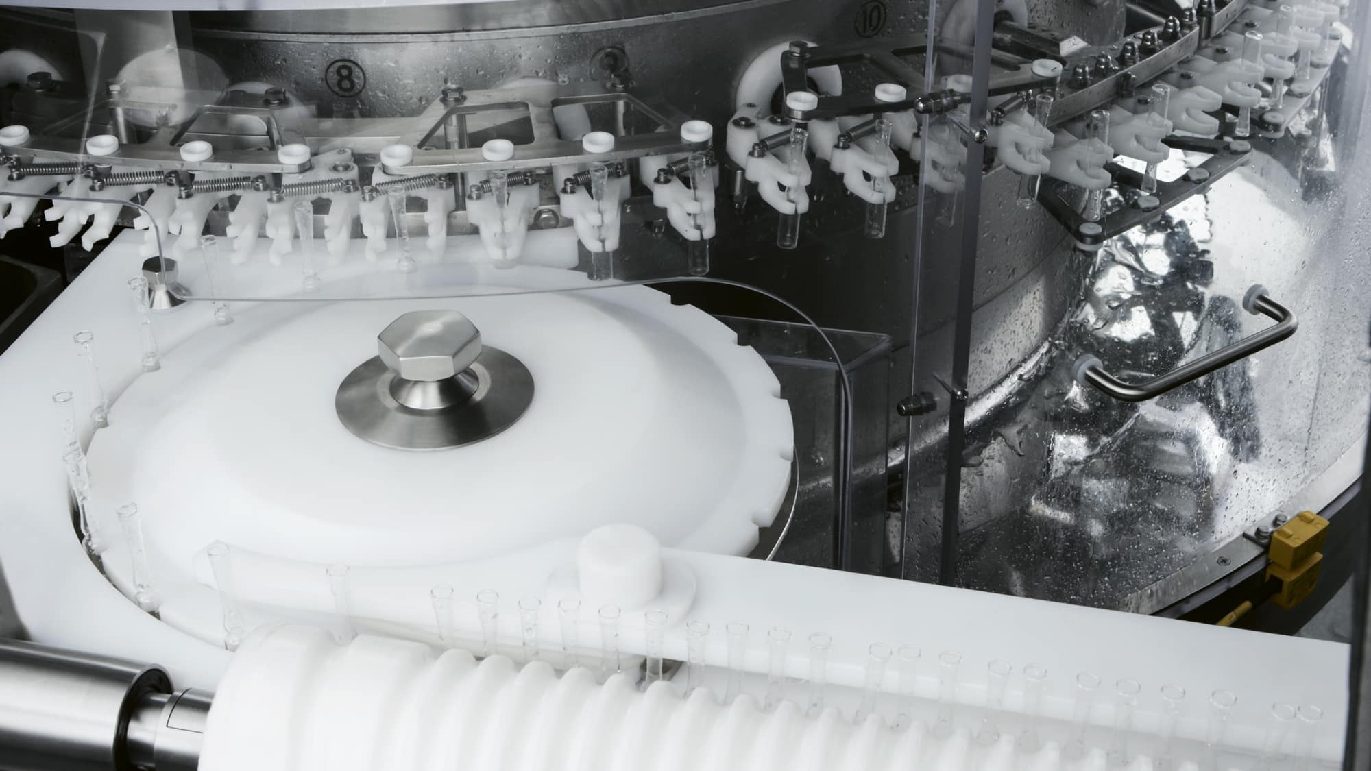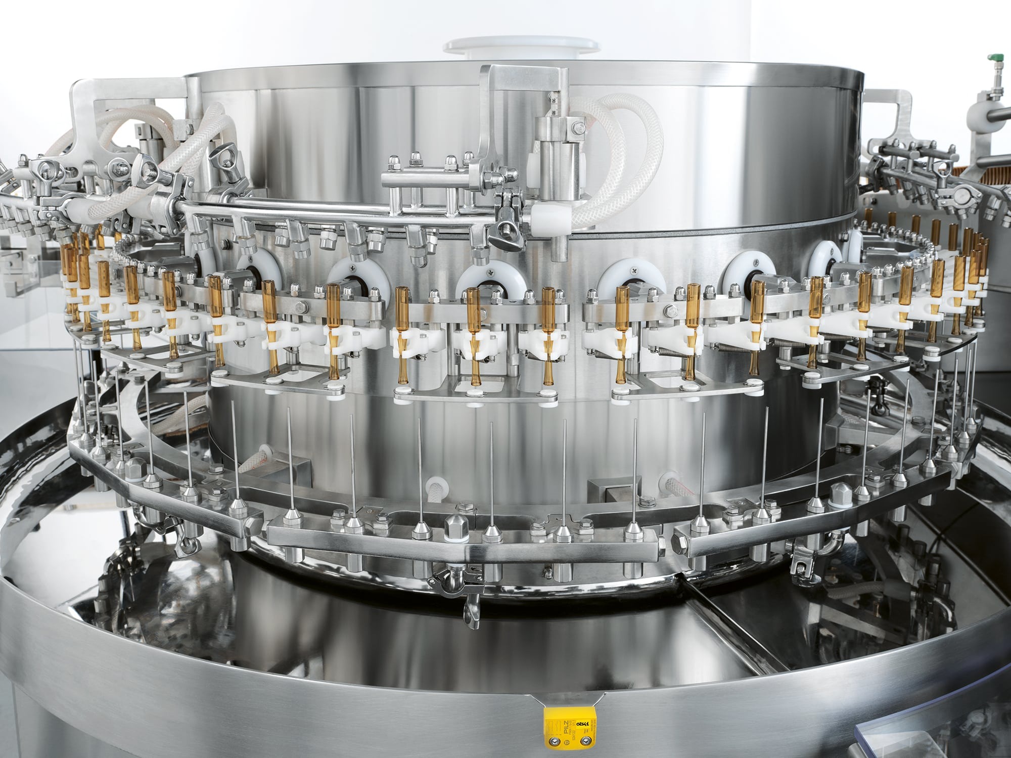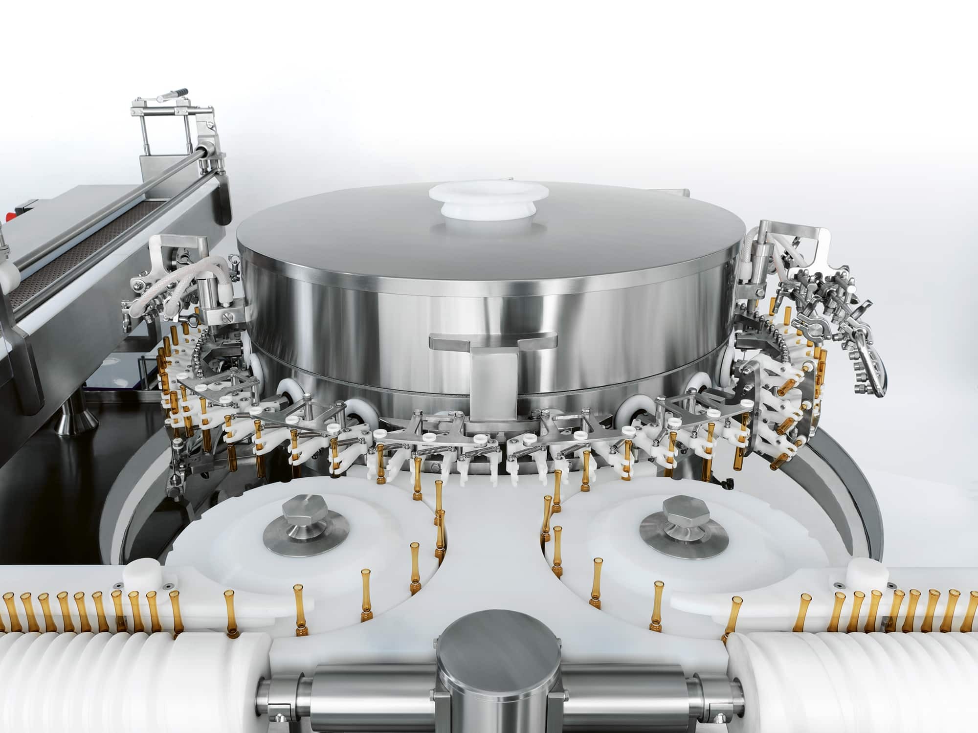 An ultrasonic bath can also be integrated to remove non-dilutable particles. In this case, containers are filled with water before entering the ultrasonic bath positioned in a tank and are transferred by a special elevator to the main carousel.