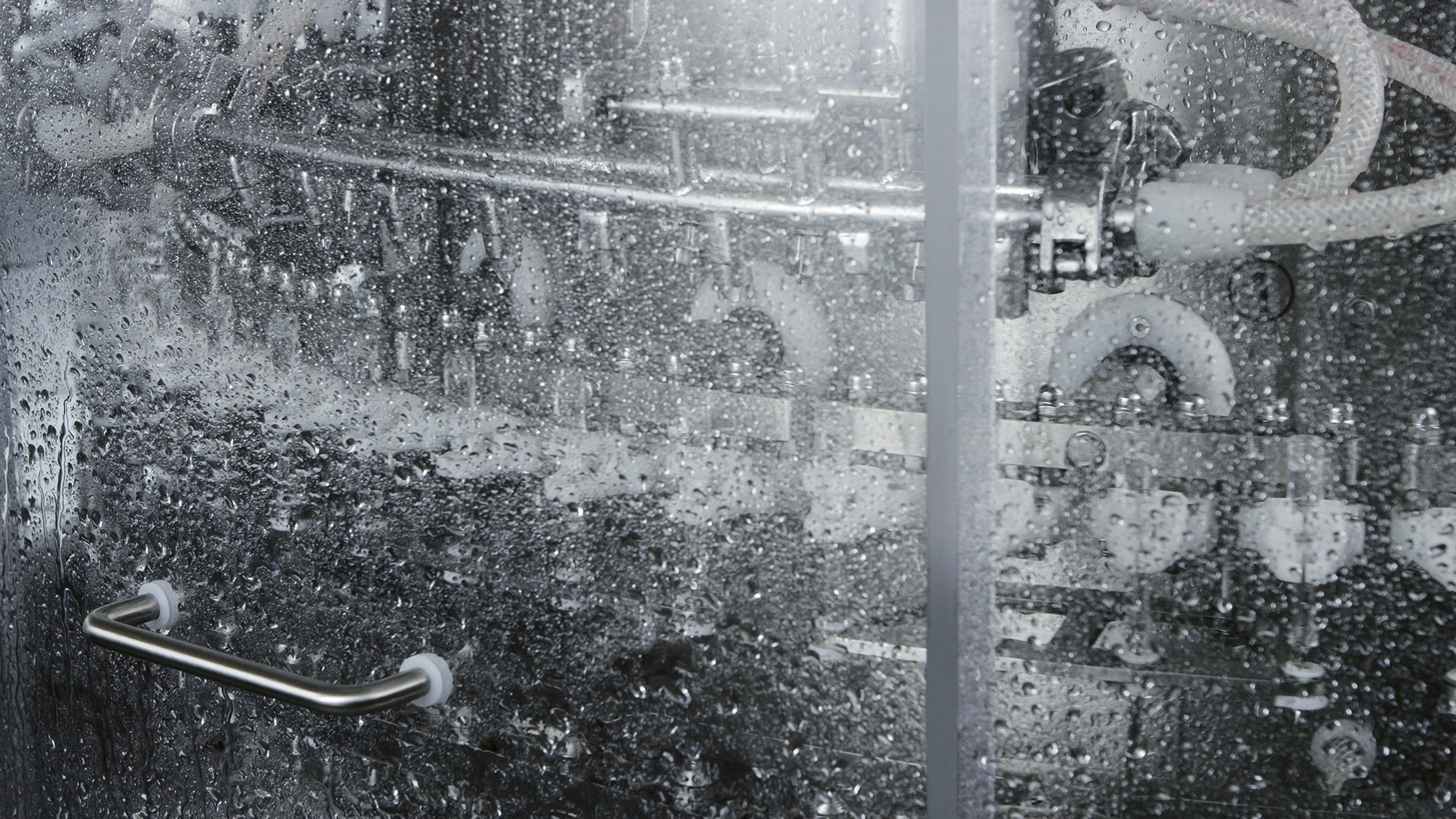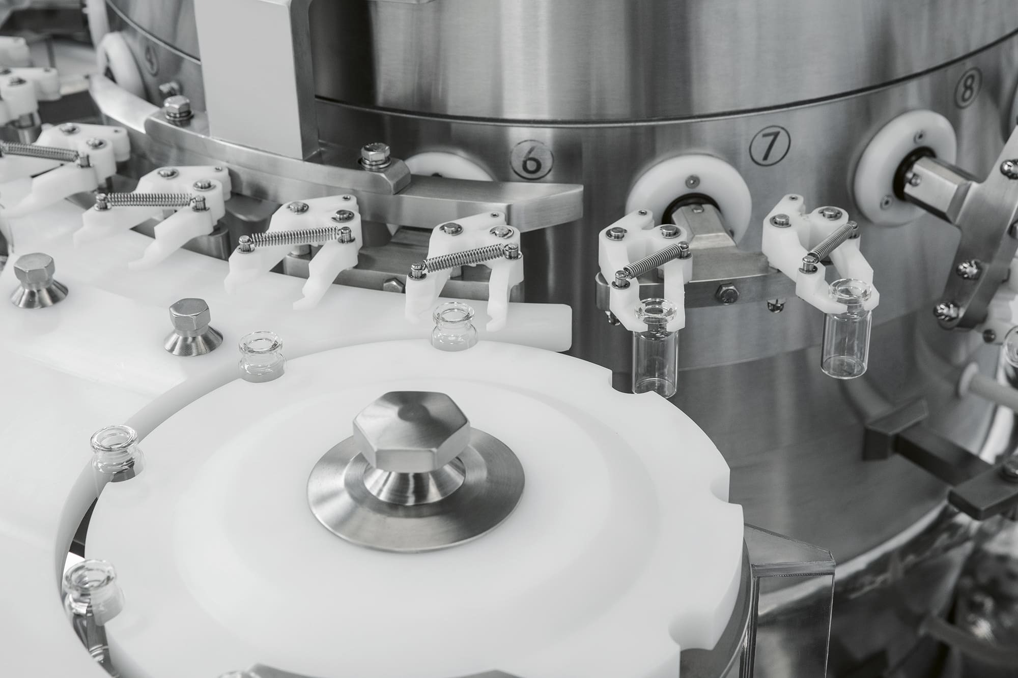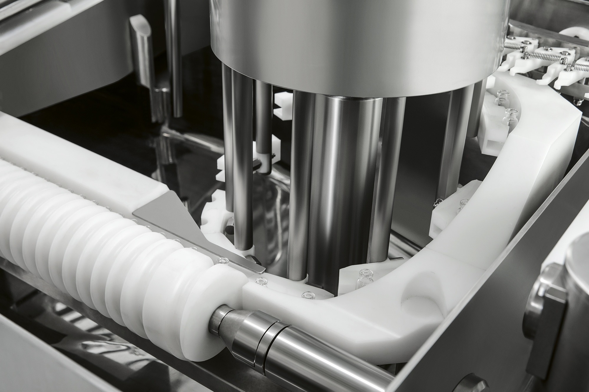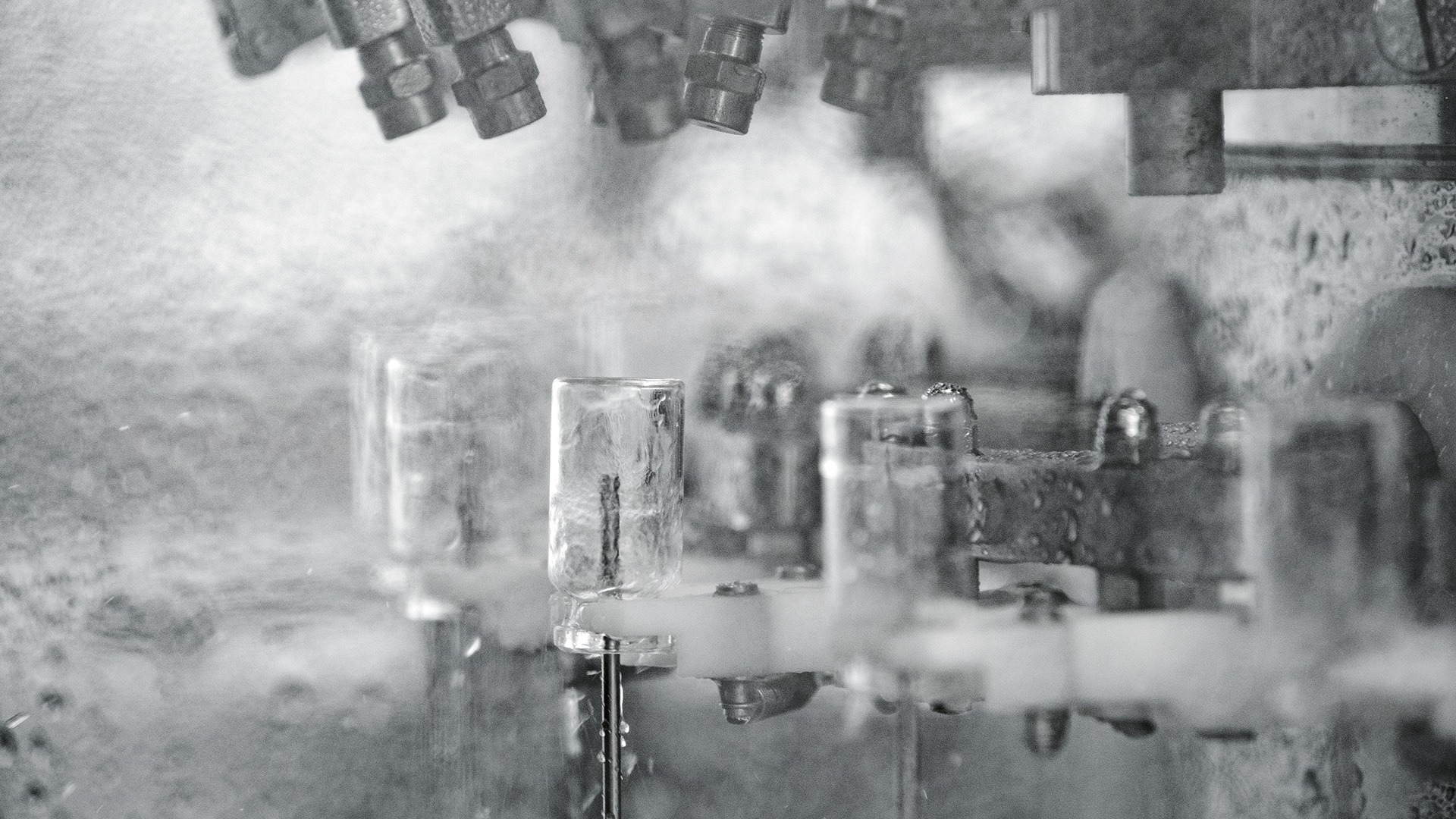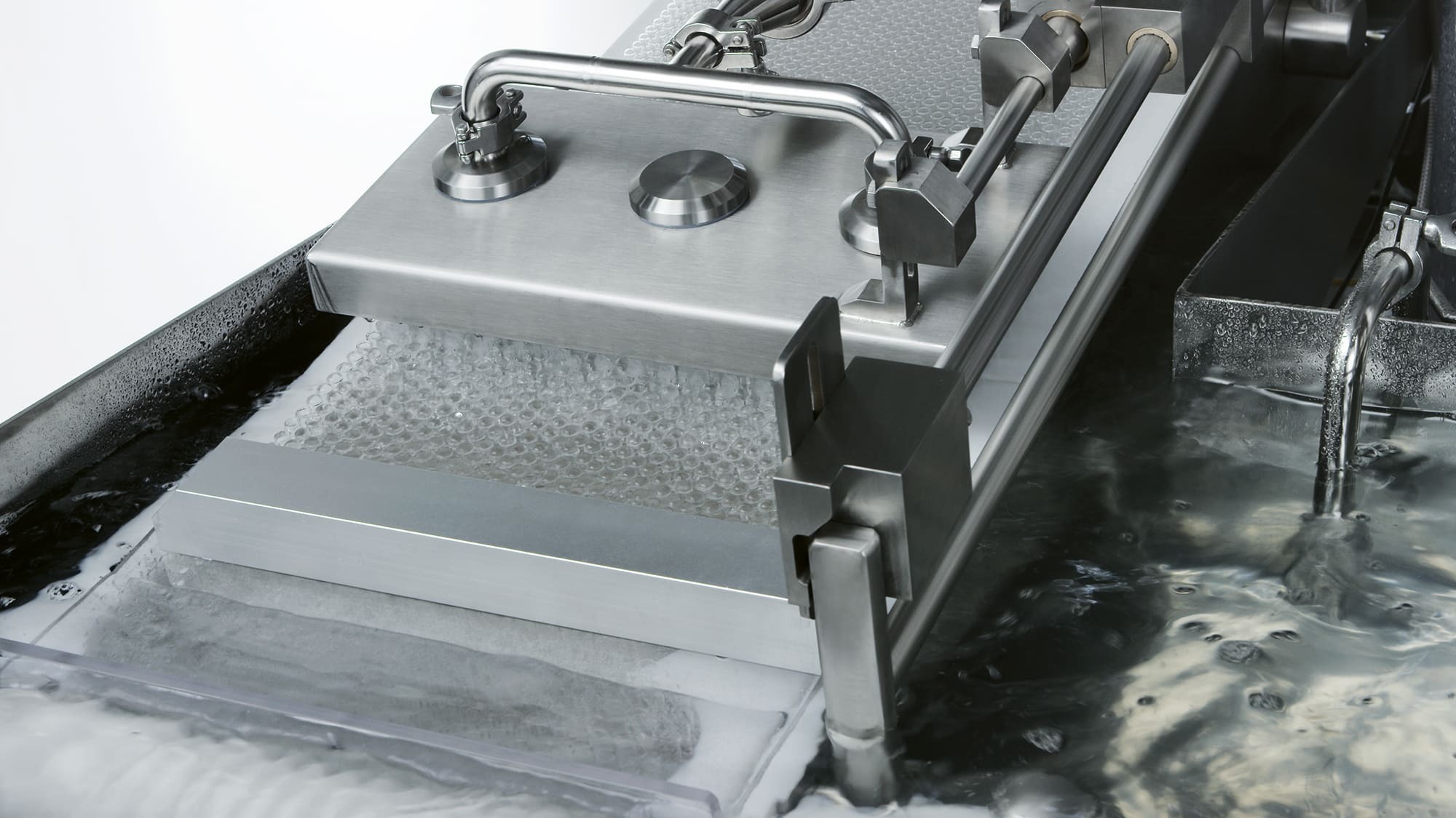 An ultrasonic bath can also be integrated to remove non-dilutable particles. In this case, containers are filled with water before entering the ultrasonic bath positioned in a tank and are transferred by a special elevator to the main carousel.