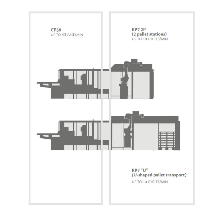 CP38 is available in different palletizer-integrated versions, according to the output speed required.