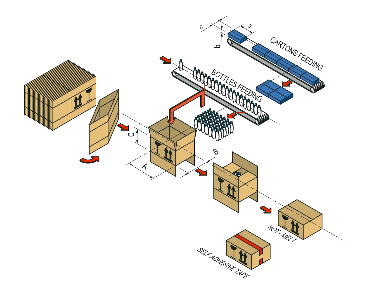 Specific infeed systems to handle a wide variety of product shapes: bundled or loose bottles and single cartons, bags and tubes.