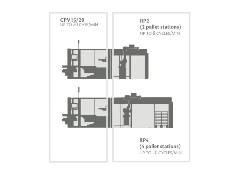 It can be integrated with the new Palletizers: RP2, with two pallet stations or RP4, with four pallet stations within a compact frame.