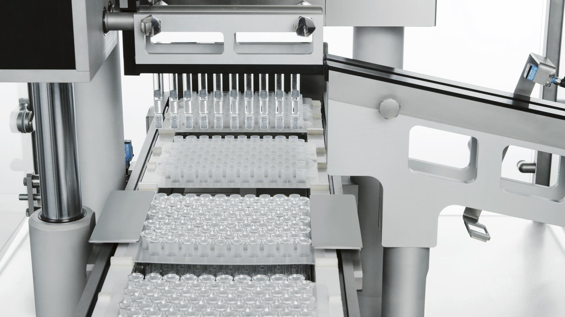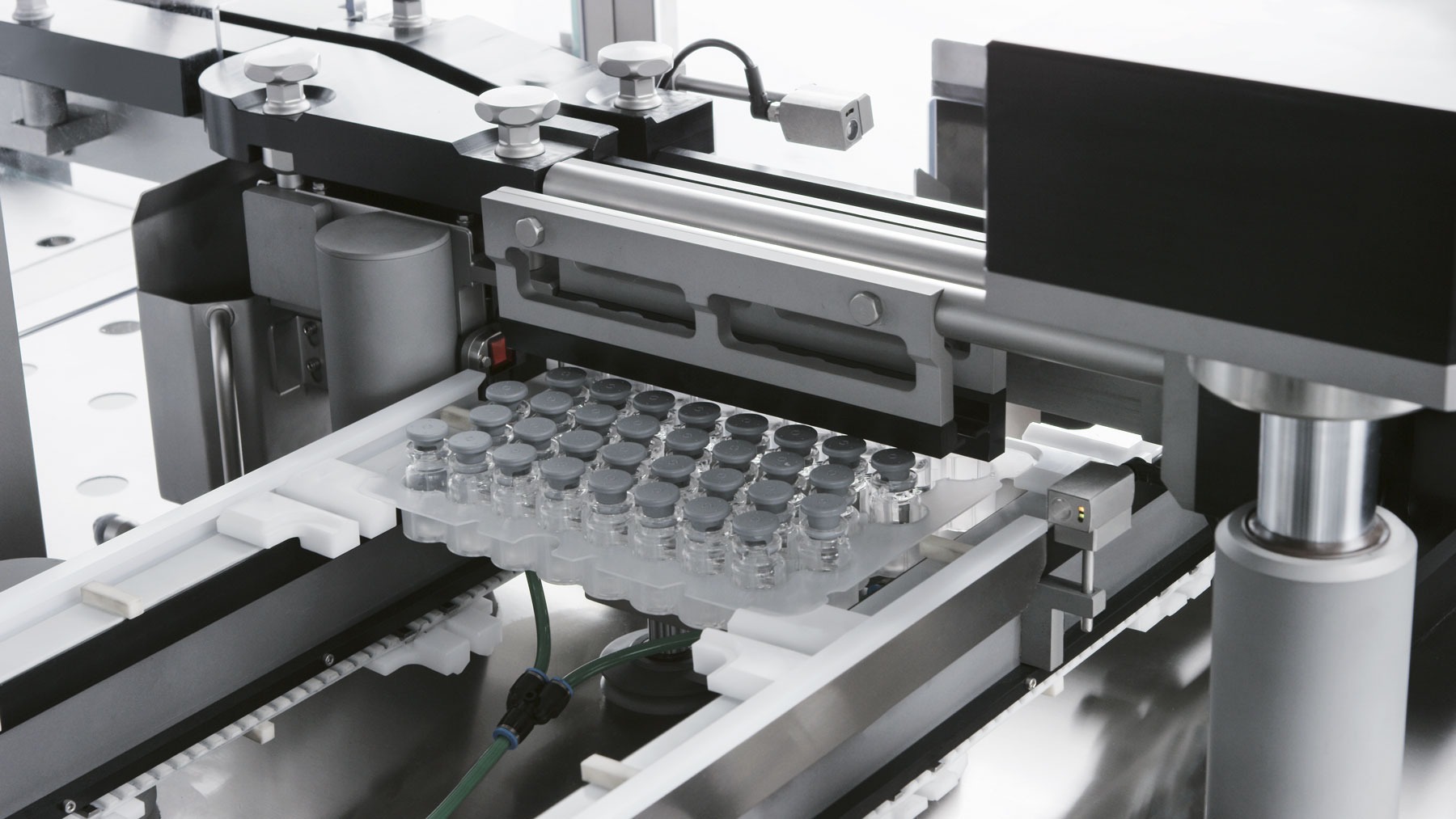 D-NEST is a compact, automatic machine for the removal of filled and plungered/stoppered RTU components from the nest to transfer them in single track to downstream equipment such as visual inspection units, syringe assembly, labelling machines, vial capping or automatic vial loading for lyo products.