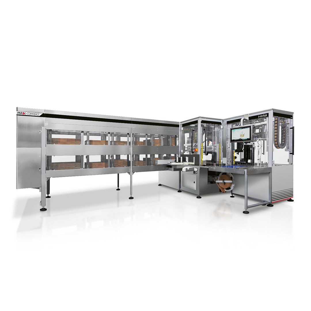 The E-CO Flex is capable to select from a magazine the pre-made case of the correct size basing on the products to be packed inside, thanks to the interaction with the customer’s management system or after inspecting the incoming products via scanner.