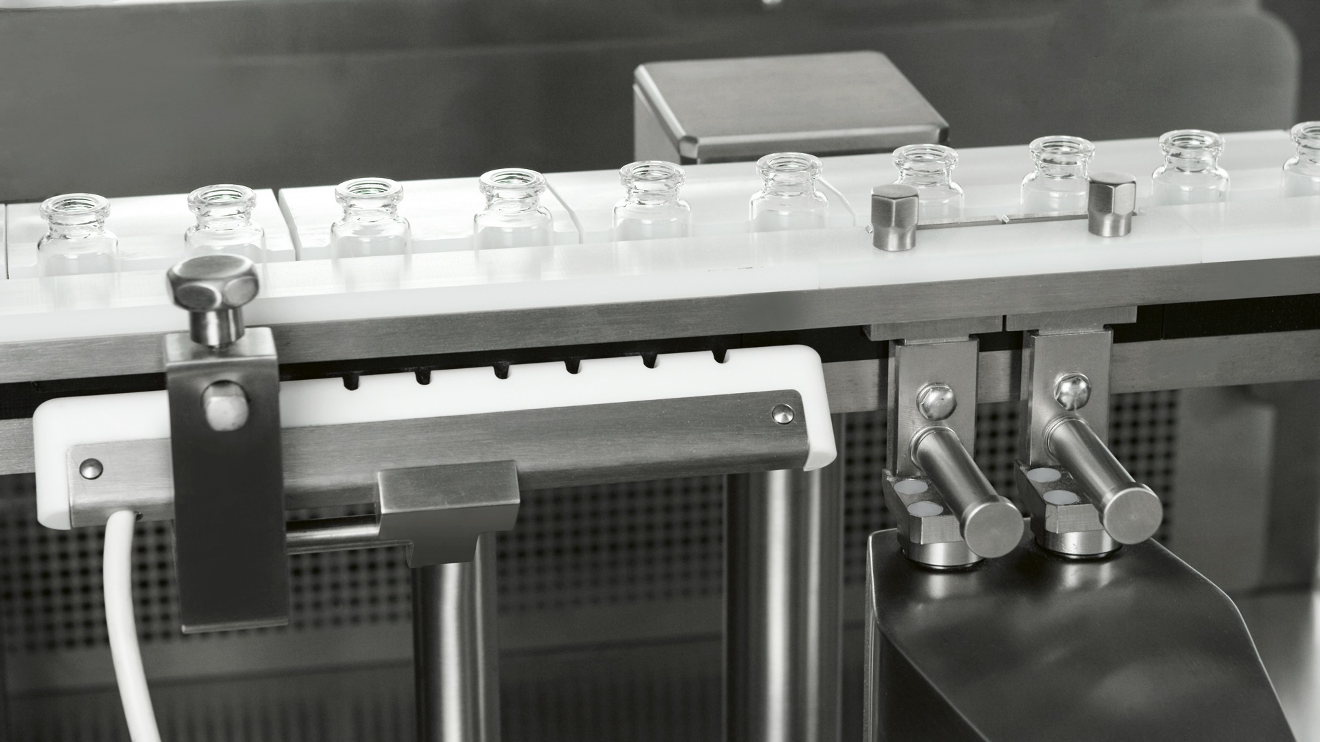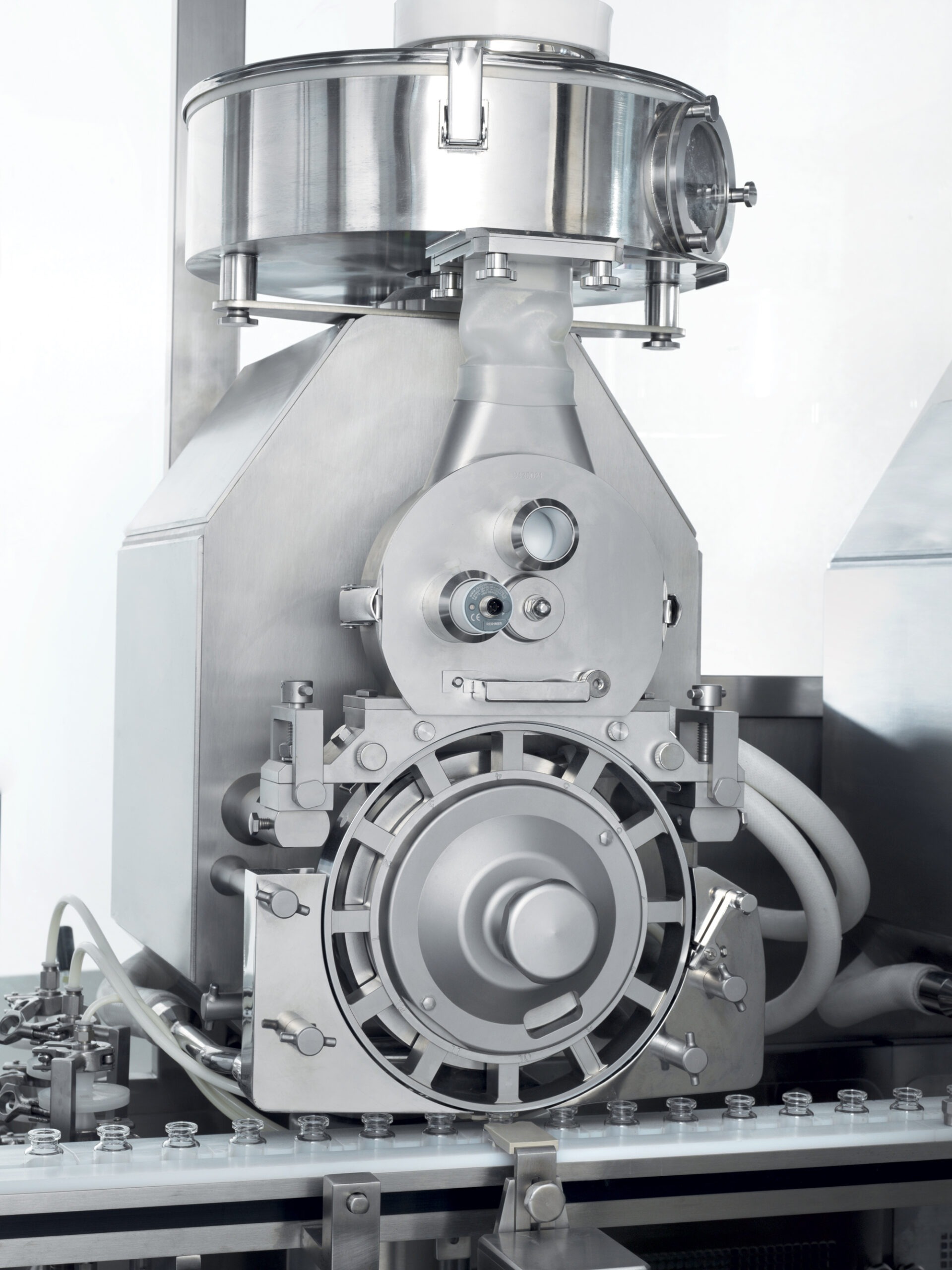 As an option, the machine can be fitted with load cells to detect the tare before powder dosing and the gross weight after dosing. In case of split fill, it is also possible to fit the load cell between the two dosing groups to detect the weight of the powder dosed by the first group.