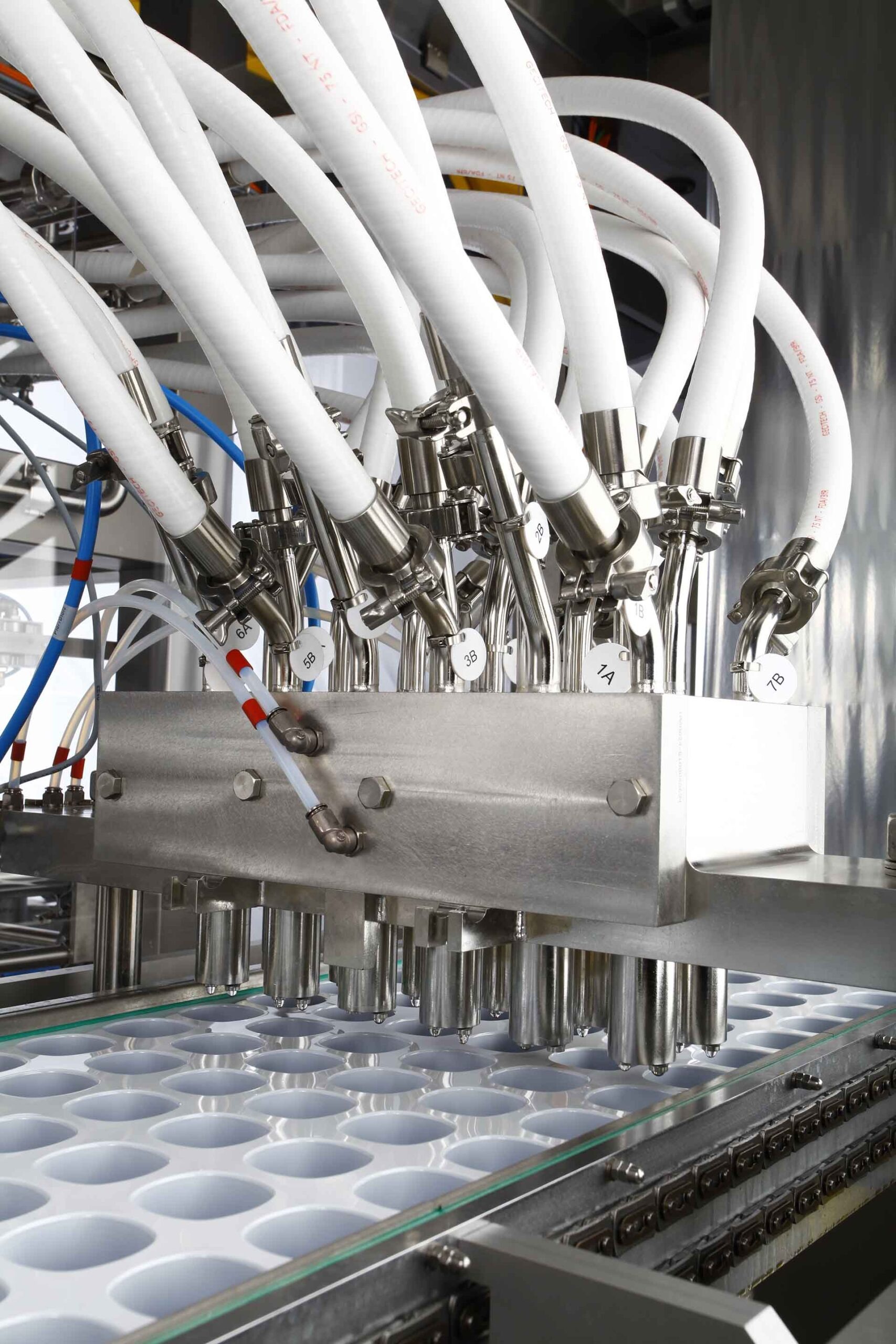 All kind of liquid-to-pasty products – with or without particulates – such as yogurt, fruit juice, white cheese, desserts, pureas, etc. can be filled.