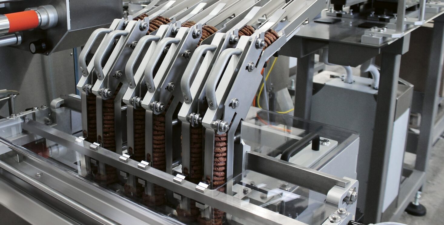 With vertical gravity feeders positioned just behind the wrapper chain, the EURO 88 PWF features a dual-motor design: one system manages the controlled drop of each pile, while the second ensures precise product transfer. This coordinated motion provides excellent flexibility and makes the unit suitable not only for traditional biscuits but also for sandwich varieties requiring careful handling.