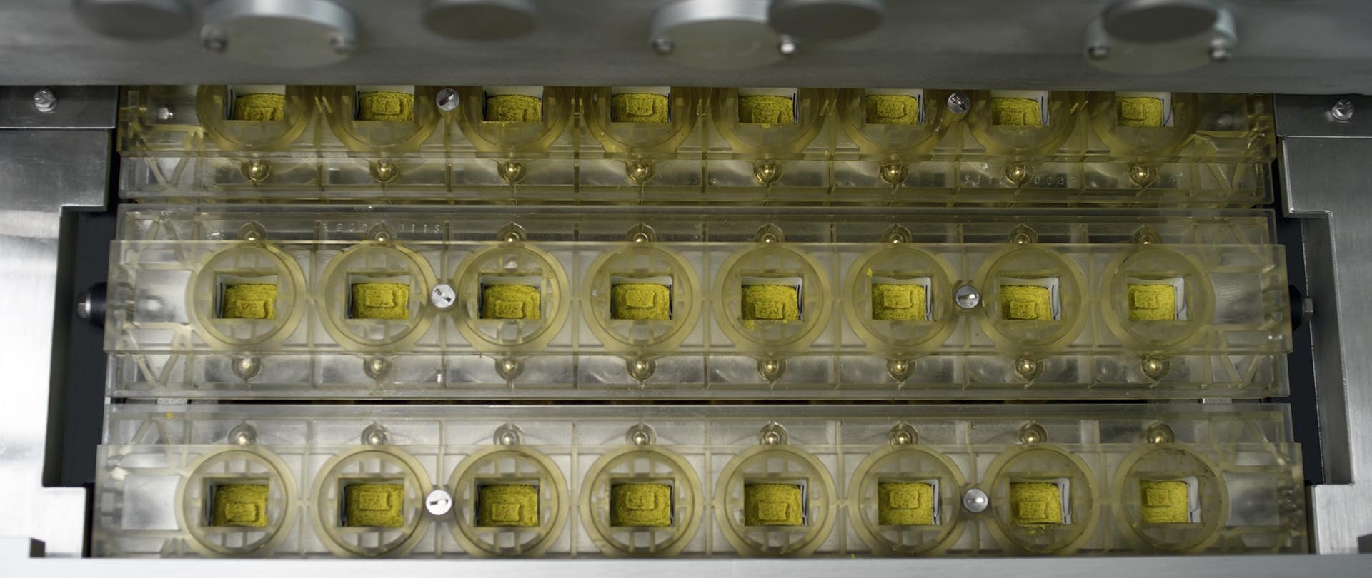 For greater speed and for customers aiming at maximum productivity together with quality and precision, the FD12 is the high-speed answer, reaching a production capacity up to 1,200 ppm. Set along the 8 lanes of the in-line filling conveyor; pre-formed foil segments are filled with the bouillon paste. The foil is then folded over, and the wrapping is pressed closed. Its advanced configuration makes the FD12 the ideal choice for producers seeking top performance and uncompromising quality.