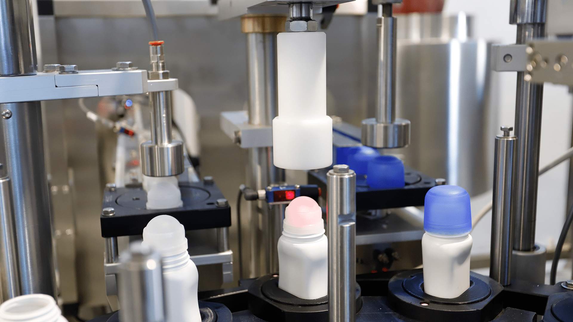 A monoblock machine for single and double pitch capping of various cap types.
