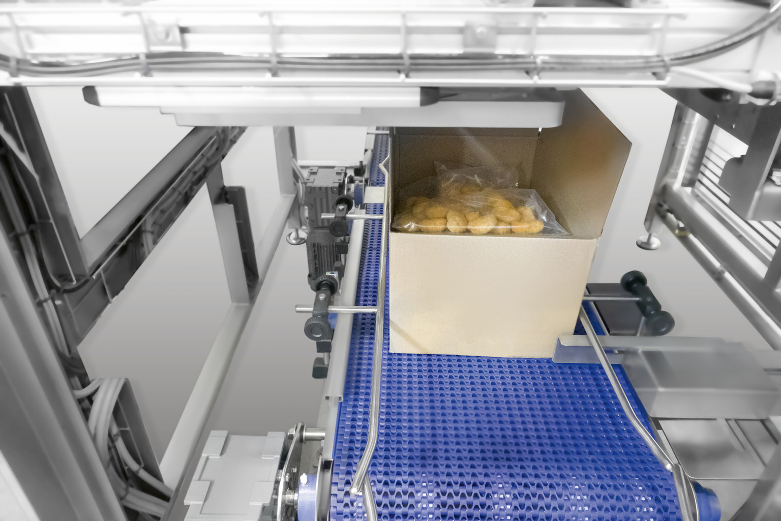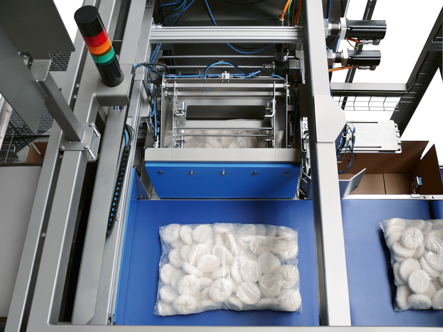 Featuring an open-frame stainless steel structure, Siemens PLC, and Schneider Linear Servo Drives, the IP 3000 ensures maximum hygiene, accuracy, and ease of use. Optional devices such as box/bag shakers and servo-driven box lifting systems further enhance performance, reducing product drop height and optimizing product placement.