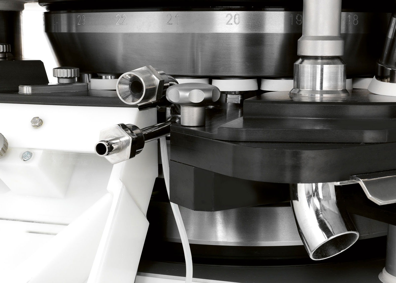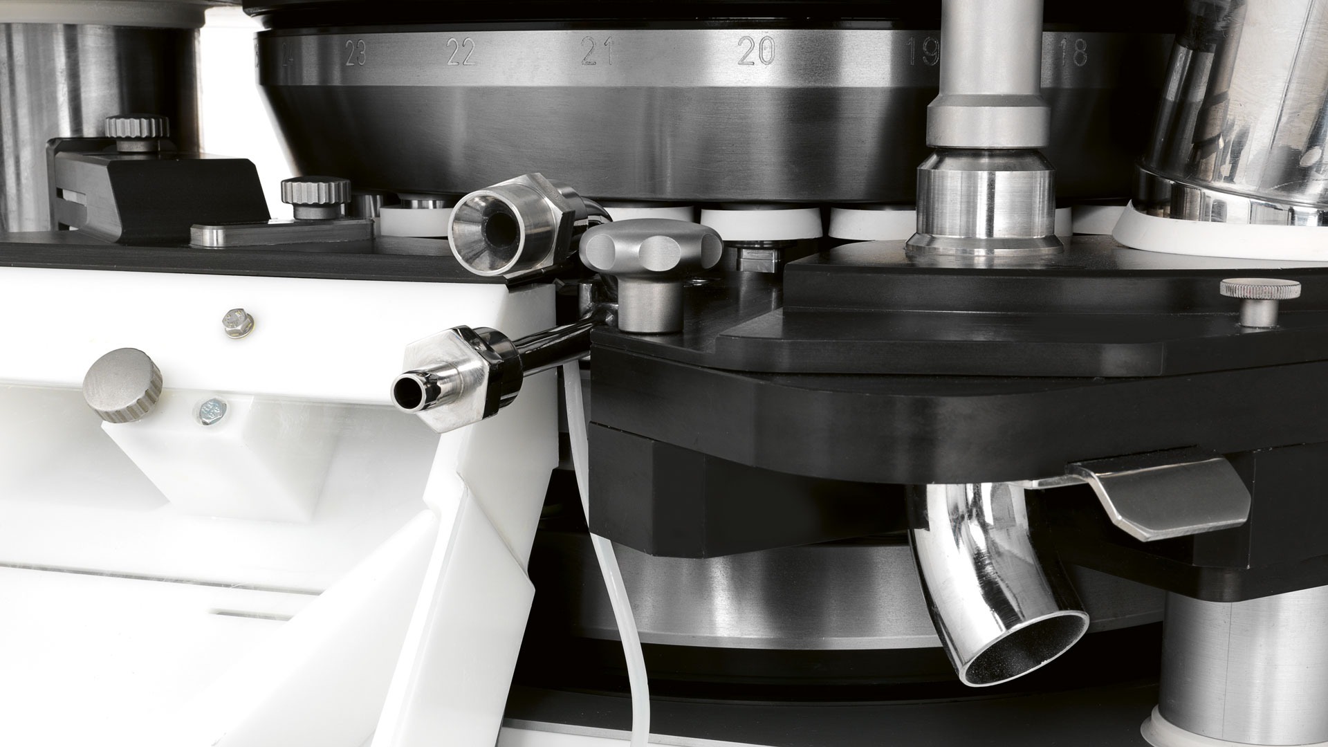 The position of the lubricant nozzle makes it possible to uniformly coat all surfaces of the tablet press tools that are in contact with the powder.