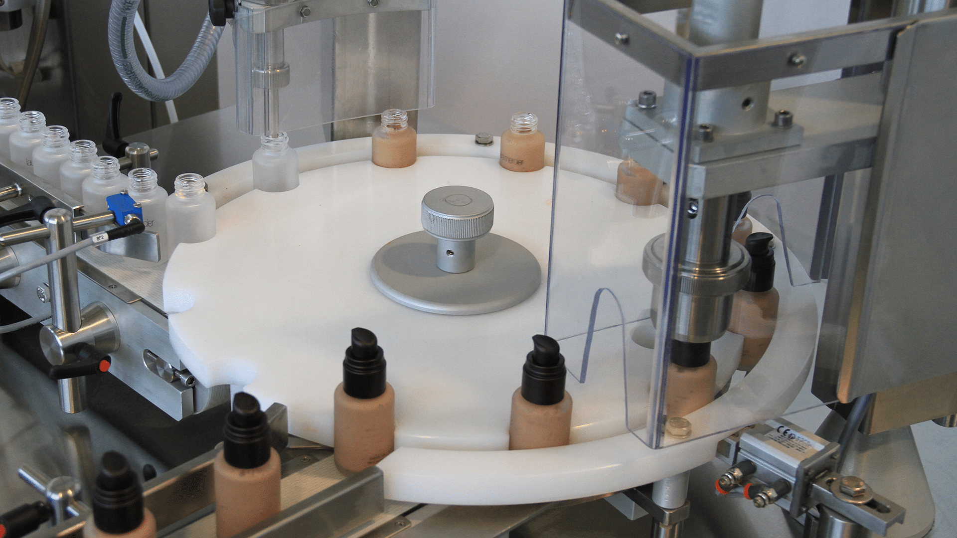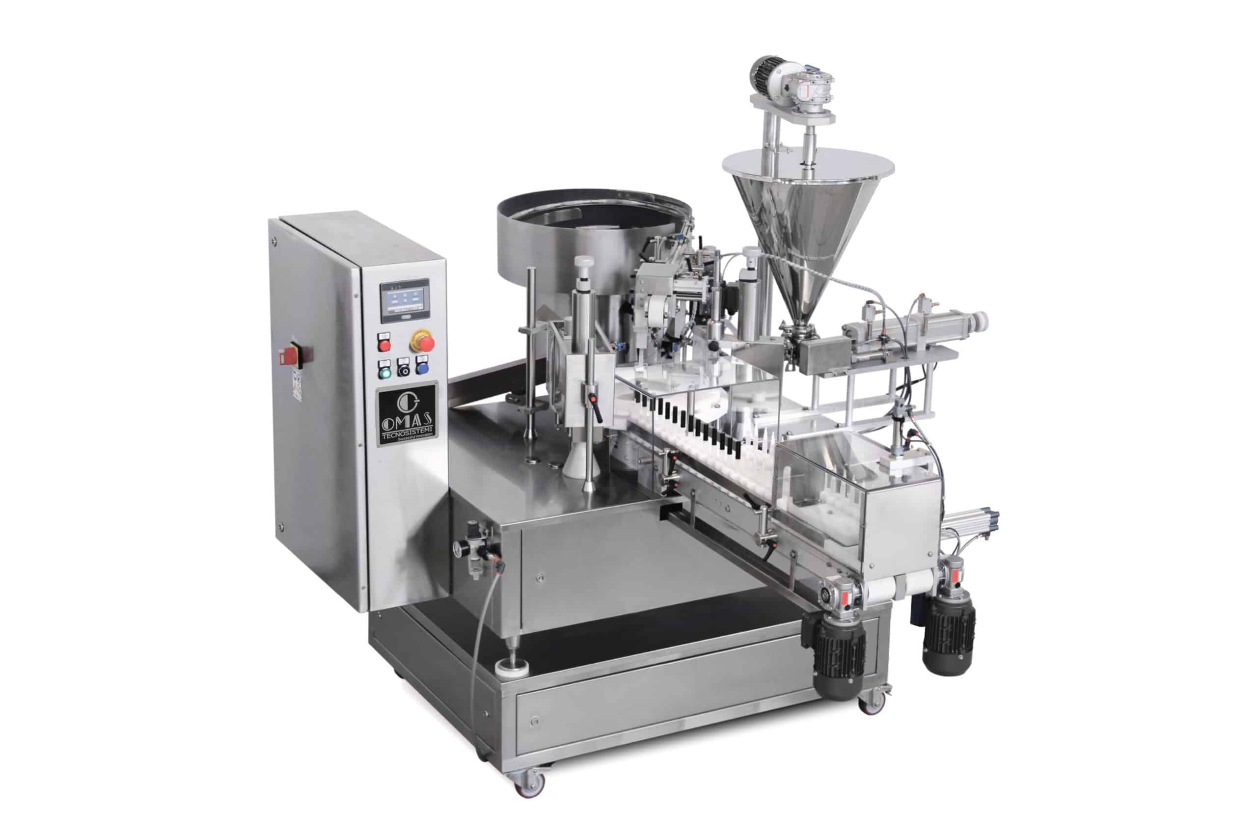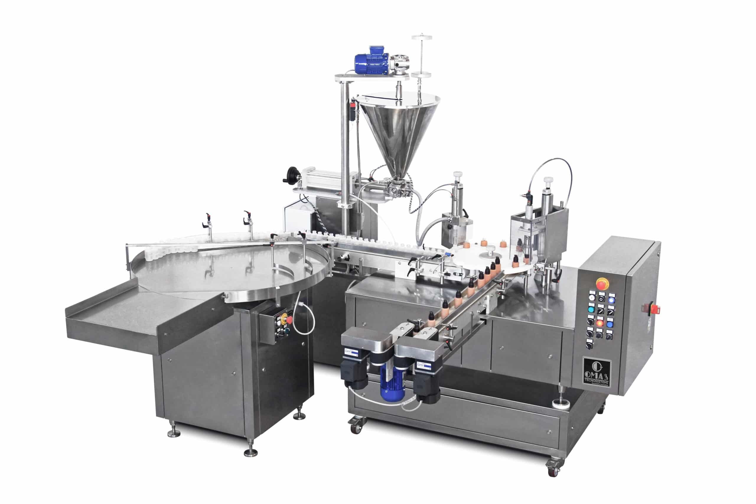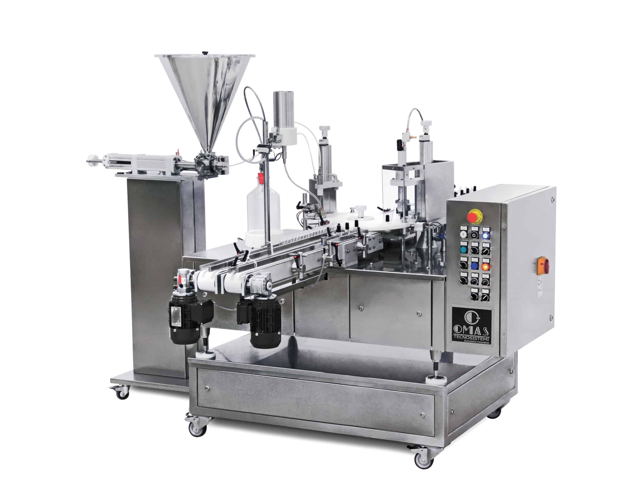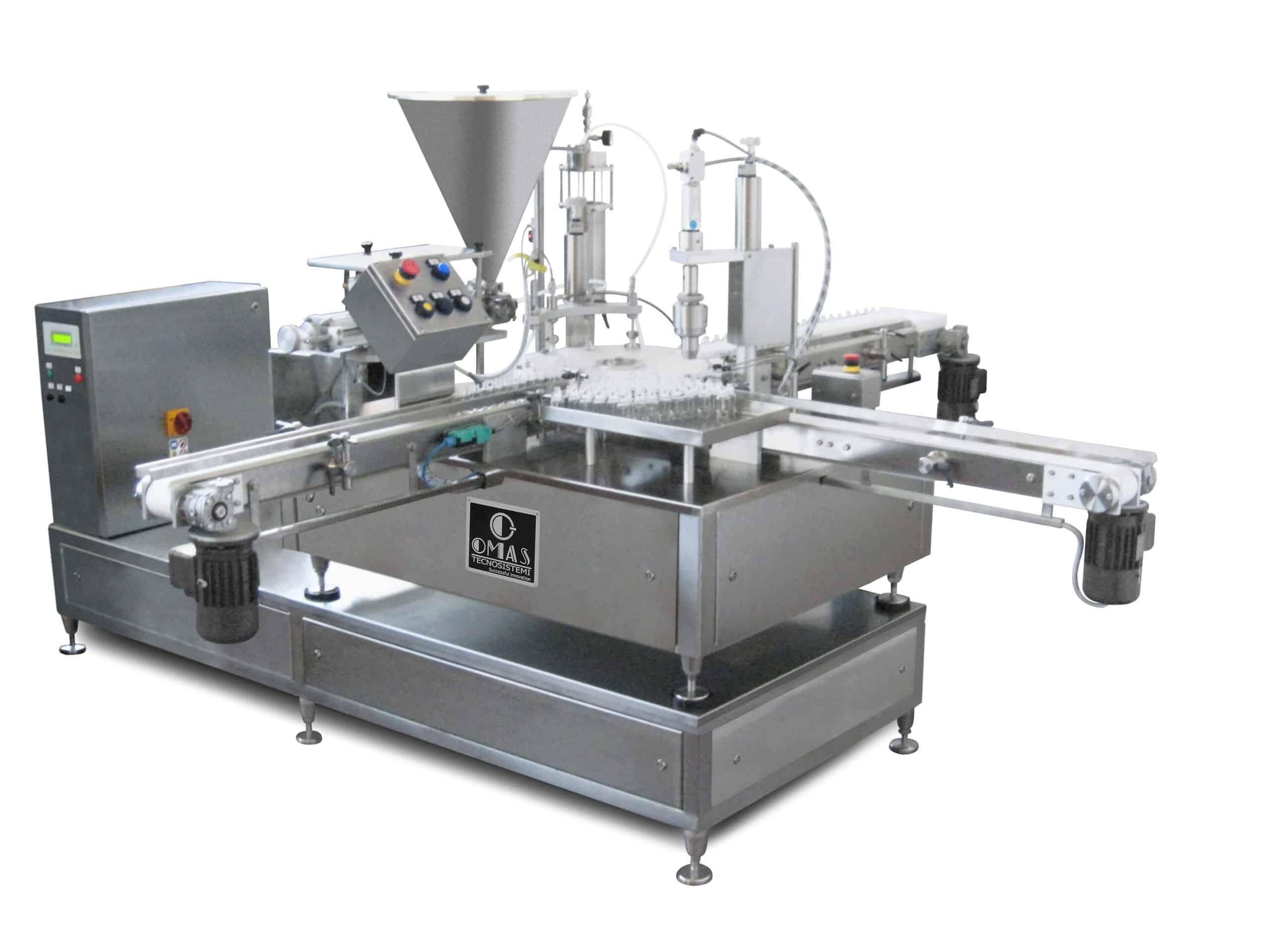 Table top monoblock for filling and capping liquids and creams products.