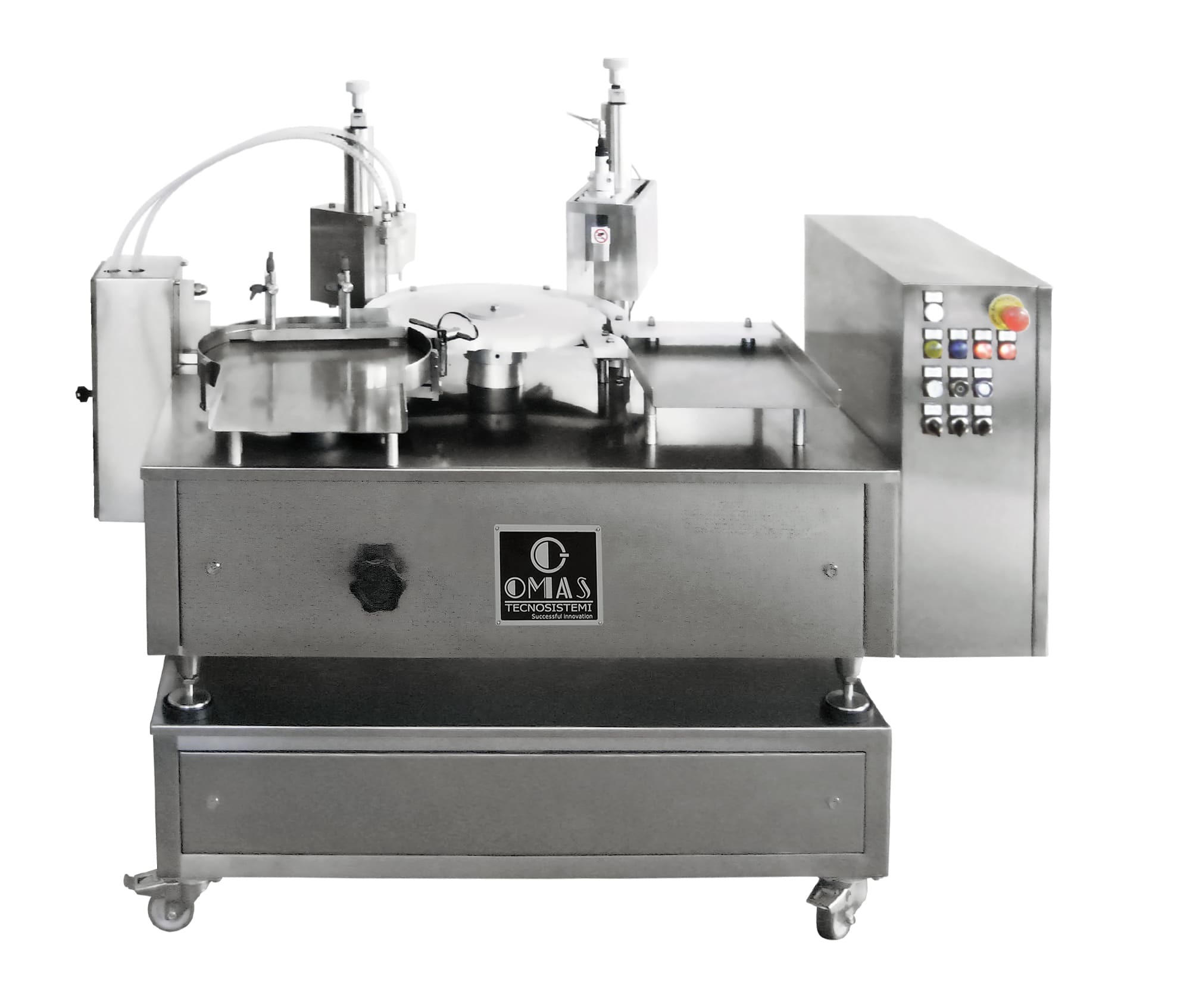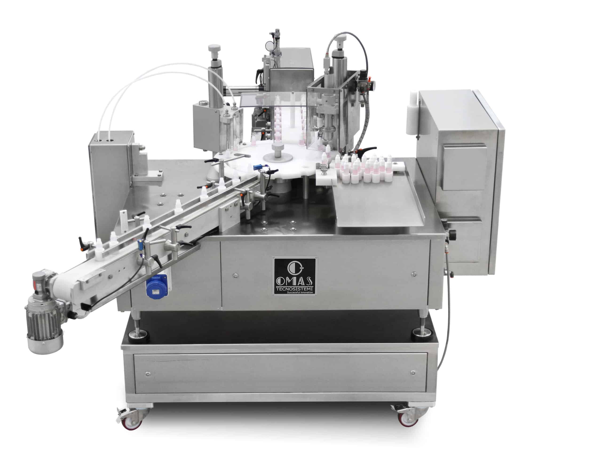 Semi automatic monoblock, specifically designed for filling and capping of samples or small sized containers. Guarantee for high accuracy and reliability. High versatility. Filling station with BTOP-FILL or FILLING UNIT, manual cap insertion, closing station for screw-cap, press-on cap, crimping.