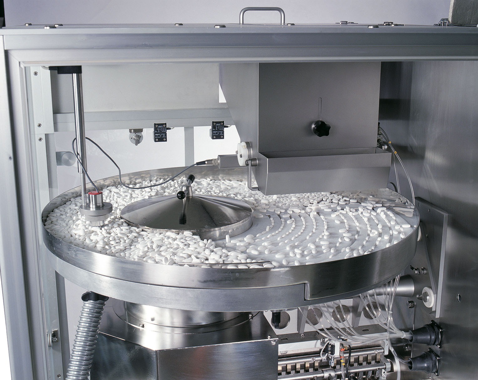 To meet the specific need to weigh tablets, IMA has designed a different product feeding system. The tablets are fed from a vibrating plate through the feeding channels to the continuous motion drum allowing tablet transfer to the weighing cells.