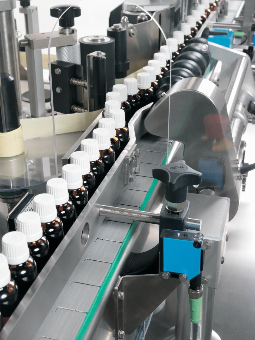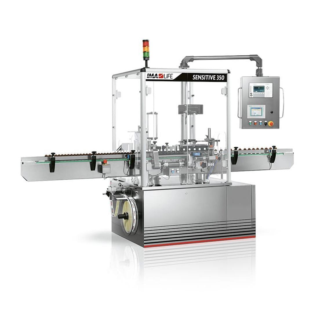 Sensitive 350 is a linear labelling machine suitable for applying self-adhesive, wrap-around labels to cylindrical glass, metal and plastic containers. Hallmarks of the machine include design simplicity and effectiveness when handling cylindrical containers, perfect for clear, essential labels containing vital information for drug identification.