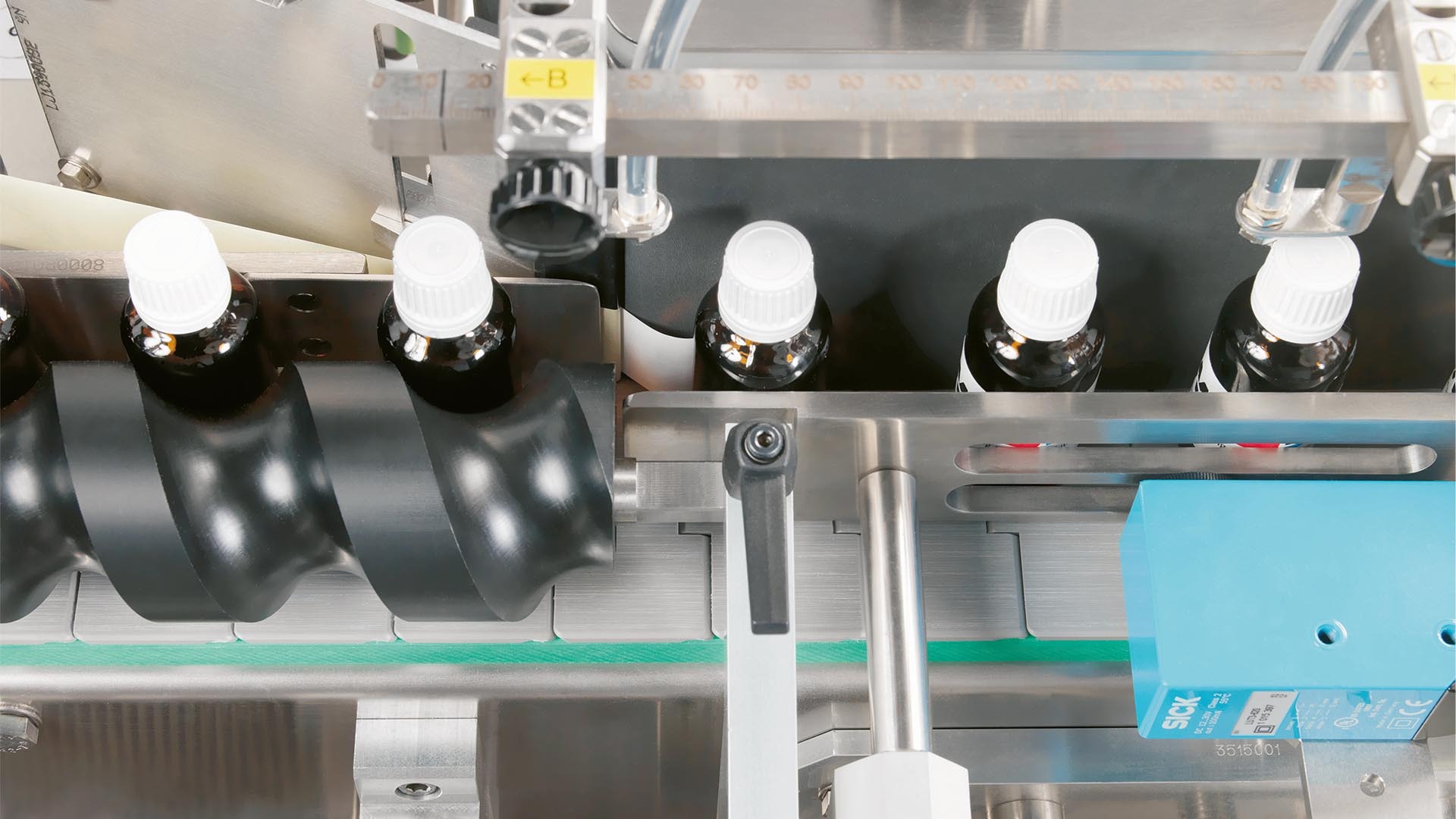Detects fallen bottles with machine stop and alarm on the control panel.