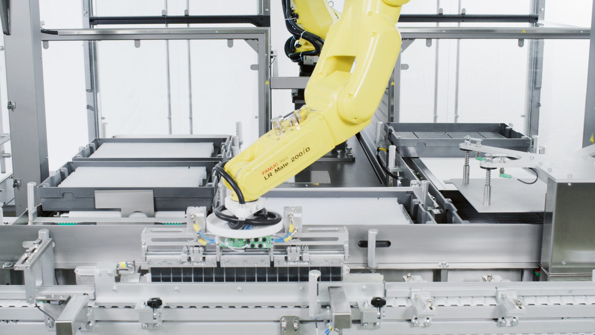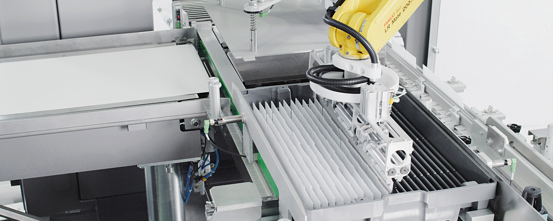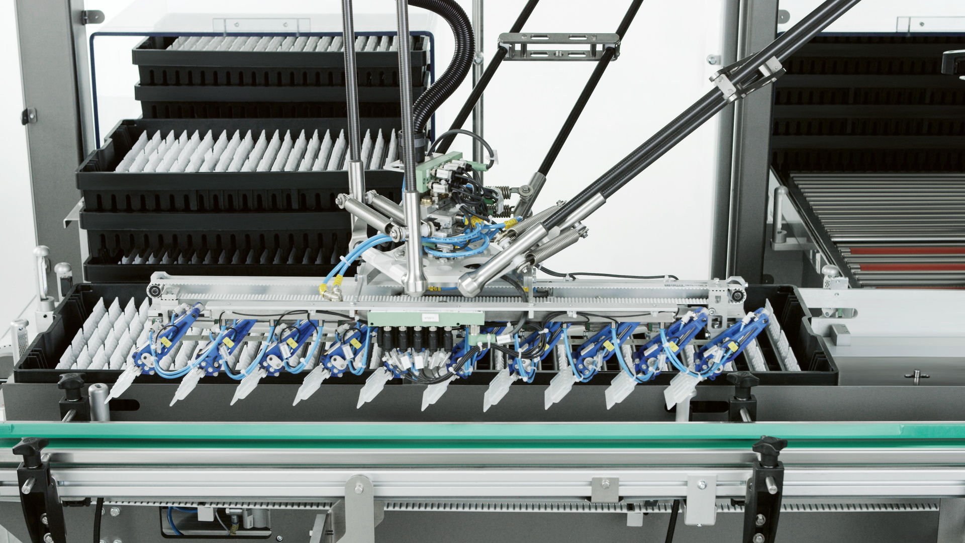 The TLS handles devices such as strips, inhalers, pens or auto-injectors, manipulating them from or into trays. This solution perfectly responds to high demands in terms of productivity and throughput when the whole production process has to be operated automatically and in a highly dynamic way. Robotic technology is at the heart of the system and allows flexible product handling at the beginning, in the middle or at the end of the line.
