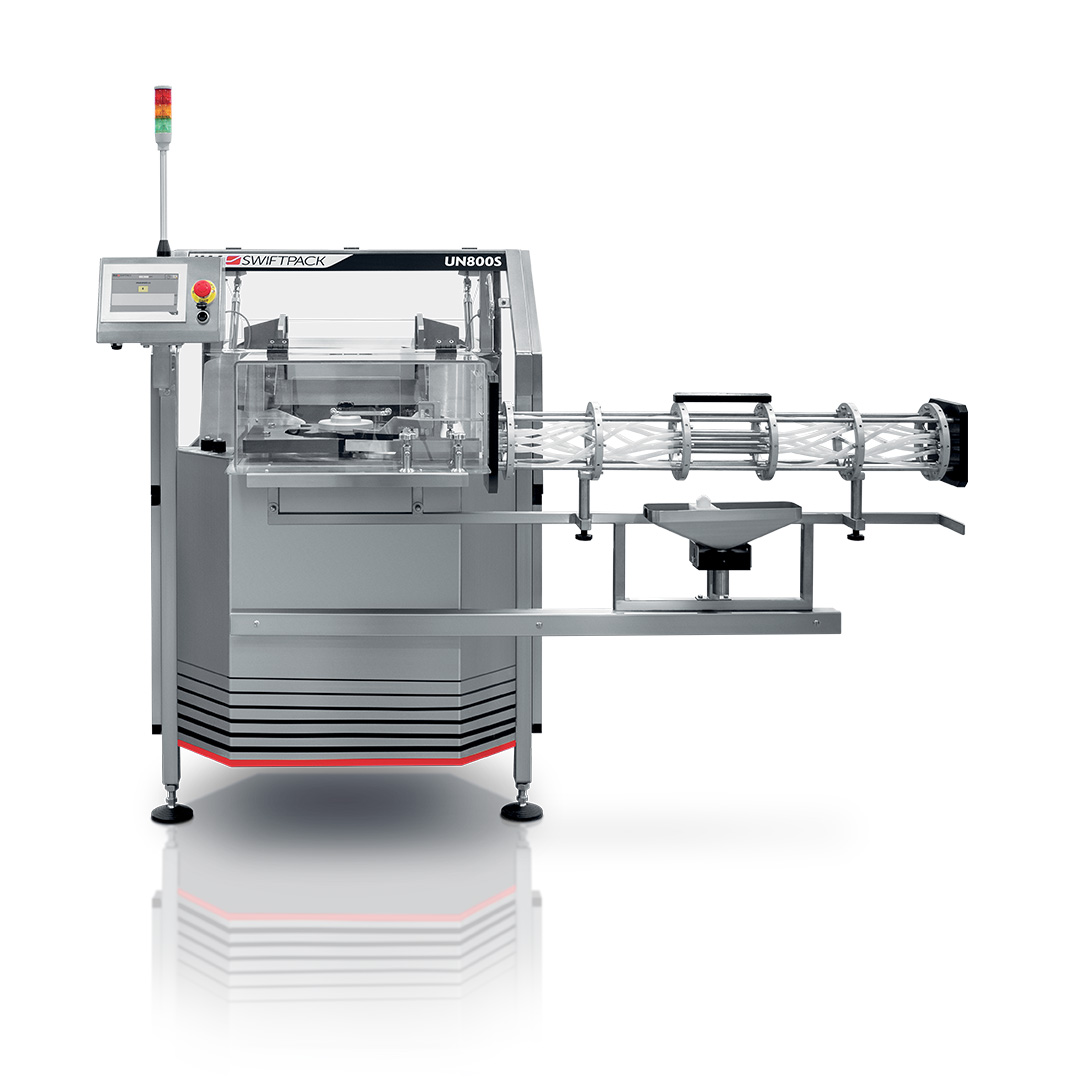 Bottles are loaded randomly into the large covered hopper from where they are raised into the starwheel by the flighted infeed. The starwheel separates the bottles loading them into pockets. Each container is then transported to a secondary starwheel for placement onto a conveyor, upside down bottles are ejected using compressed air. As an integrated system the rotary unscrambler can be synchronised to line outputs and container back up controls will start and stop system on demand.