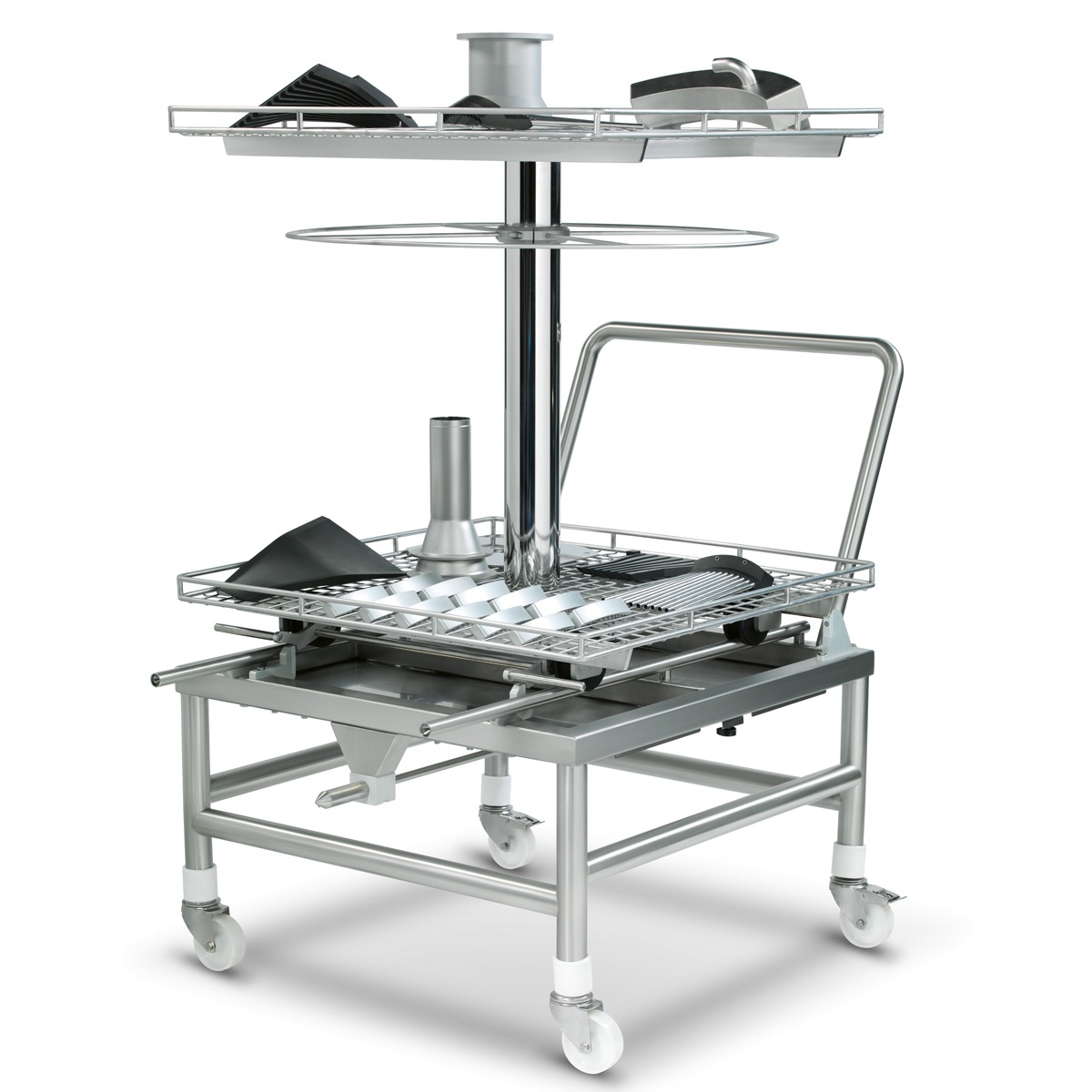 Two-shelf basket for increased throughput. Drum and hose washing racks as an option.