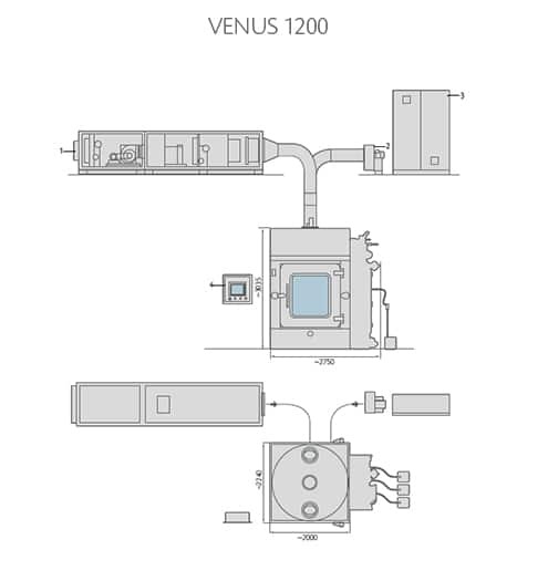 Venus water recirculation system allows consumption saving and reduces the disposal of dirty water at the end of the washing cycle, while granting optimal equipment performance. The AHU allows energy efficiency thanks to the recovery of treated air which is used to cool/heat the incoming air thus maintaining optimal system performance.