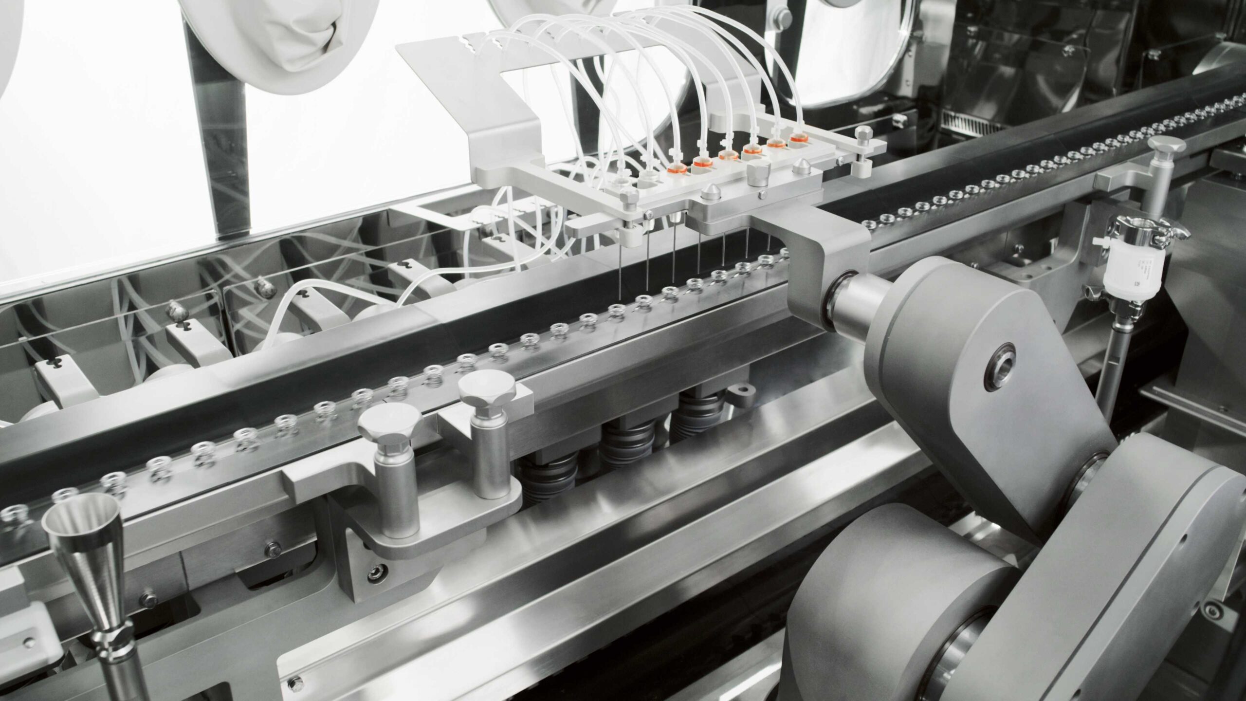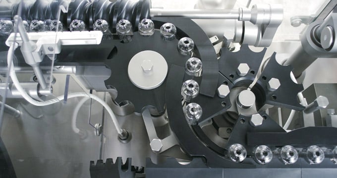 During the aseptic filling of dose containers with a drug, essential is preventing its contamination, thus minimising its exposure to environment, equipment, manipulation from operators, etc., until its sealing.