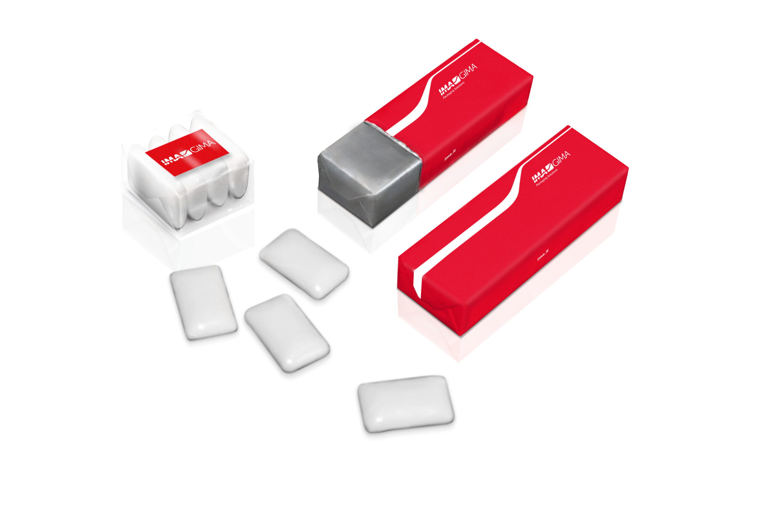 High-speed wrapping machine processing stick packs containing gum pellets, mints and pressed candies, packaged with on-edge product orientation.