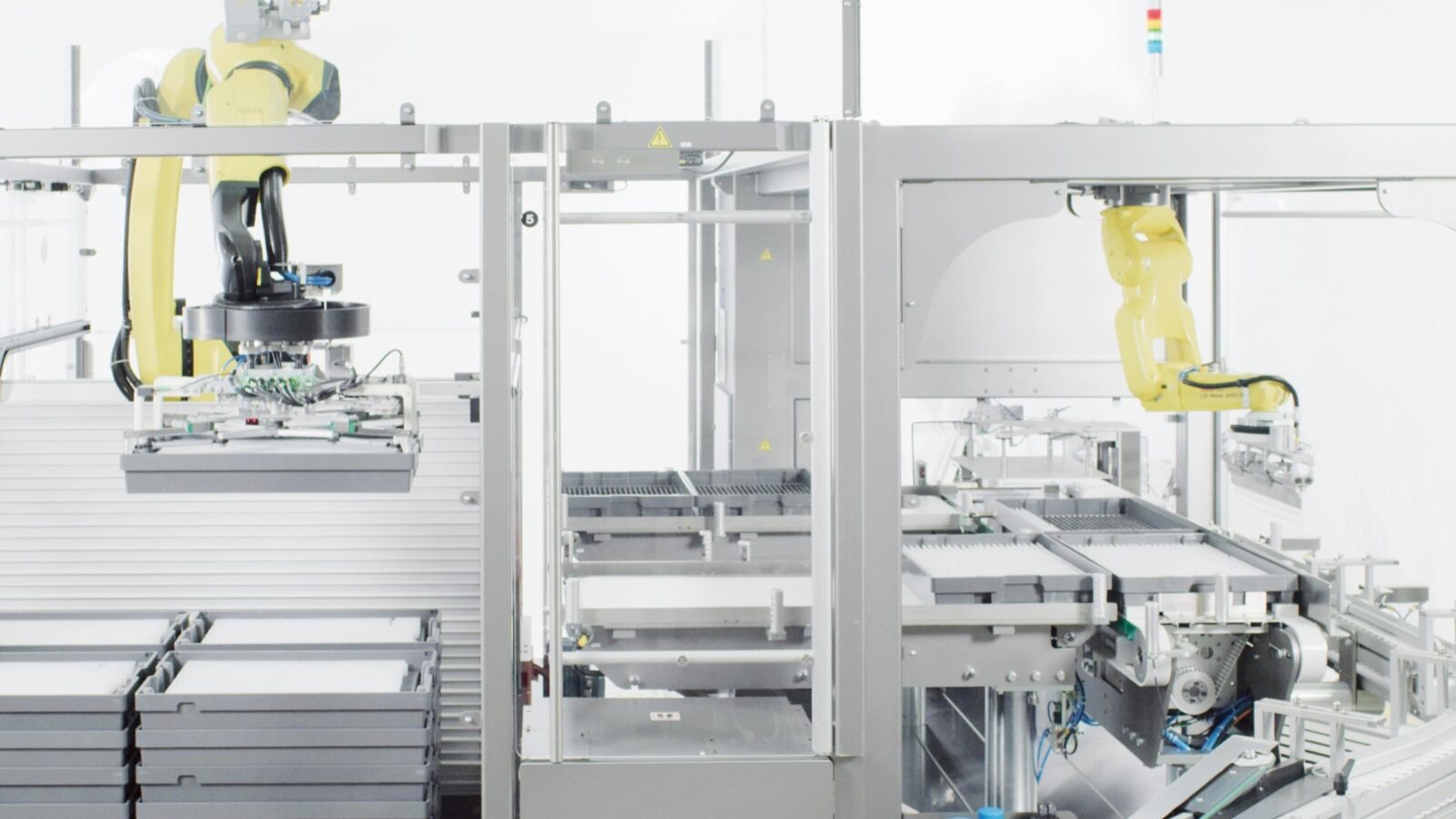 - Start of the line: robotic depalletizes and tray unloading systems feed components into the line.