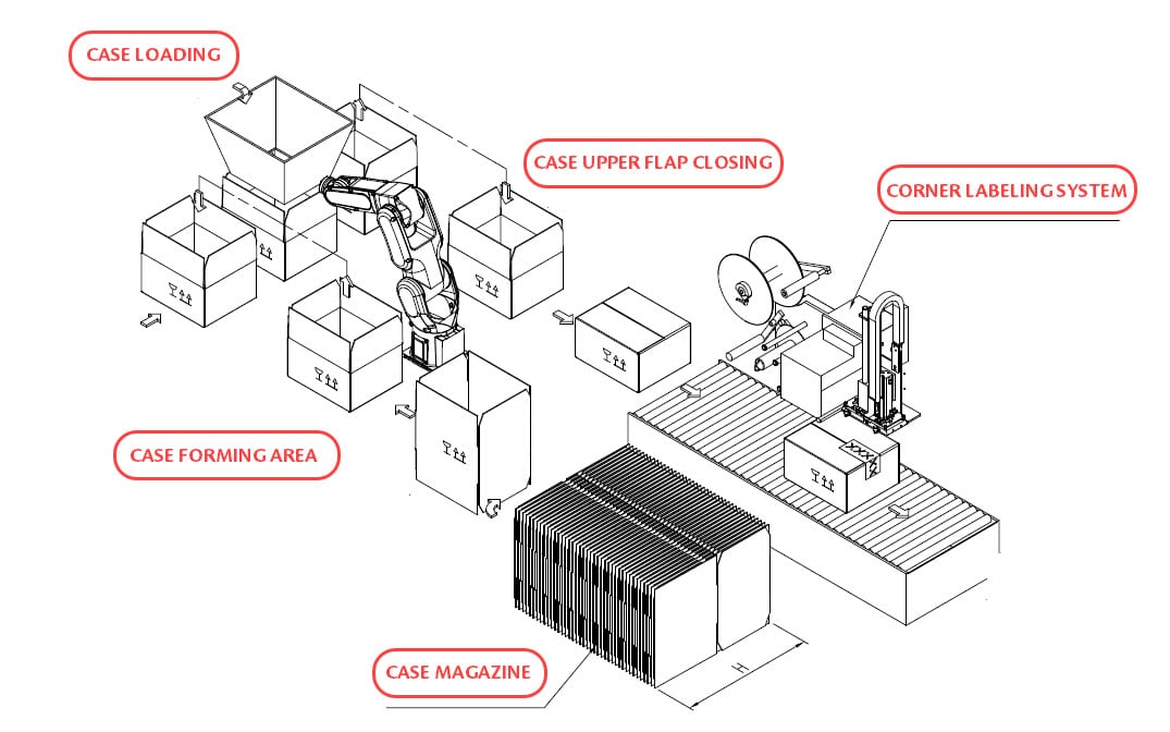 - Ingenious Case Transport: both the case magazine and the exit point are positioned on the same side of the machine. This “way in, way out” configuration minimizes the machine’s footprint and contributes to a more compact and accessible line design.