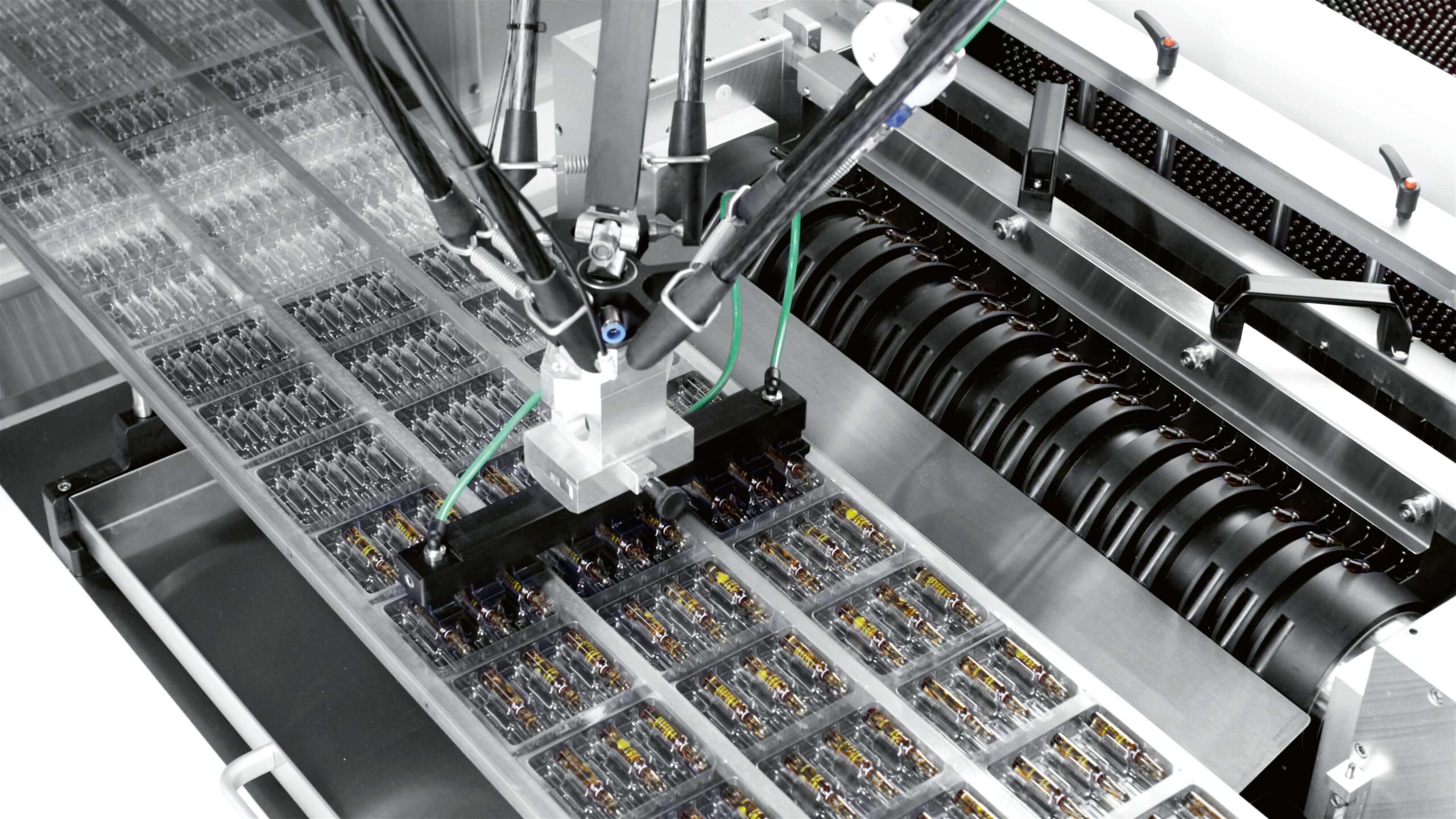 Robotically controlled systems developed in-house feed any parenteral product and accessory into the thermoformer. Solutions combining an advanced preheating system with the forming process provide uniform film thickness. Thanks to our fully in-house development of robotic systems, we offer standardized solutions for both product feeding and integration with cartoning. This not only ensures seamless system coordination but also simplifies operator training and enhances overall usability.