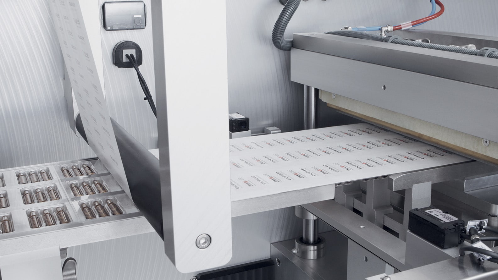 If tray sealing is required, a sealing unit can be installed that guarantees uniform sealing pressure and offsets any irregular thickness in the materials. The cutting area provides excellent access and the unit is easily removable for size changeovers. -
