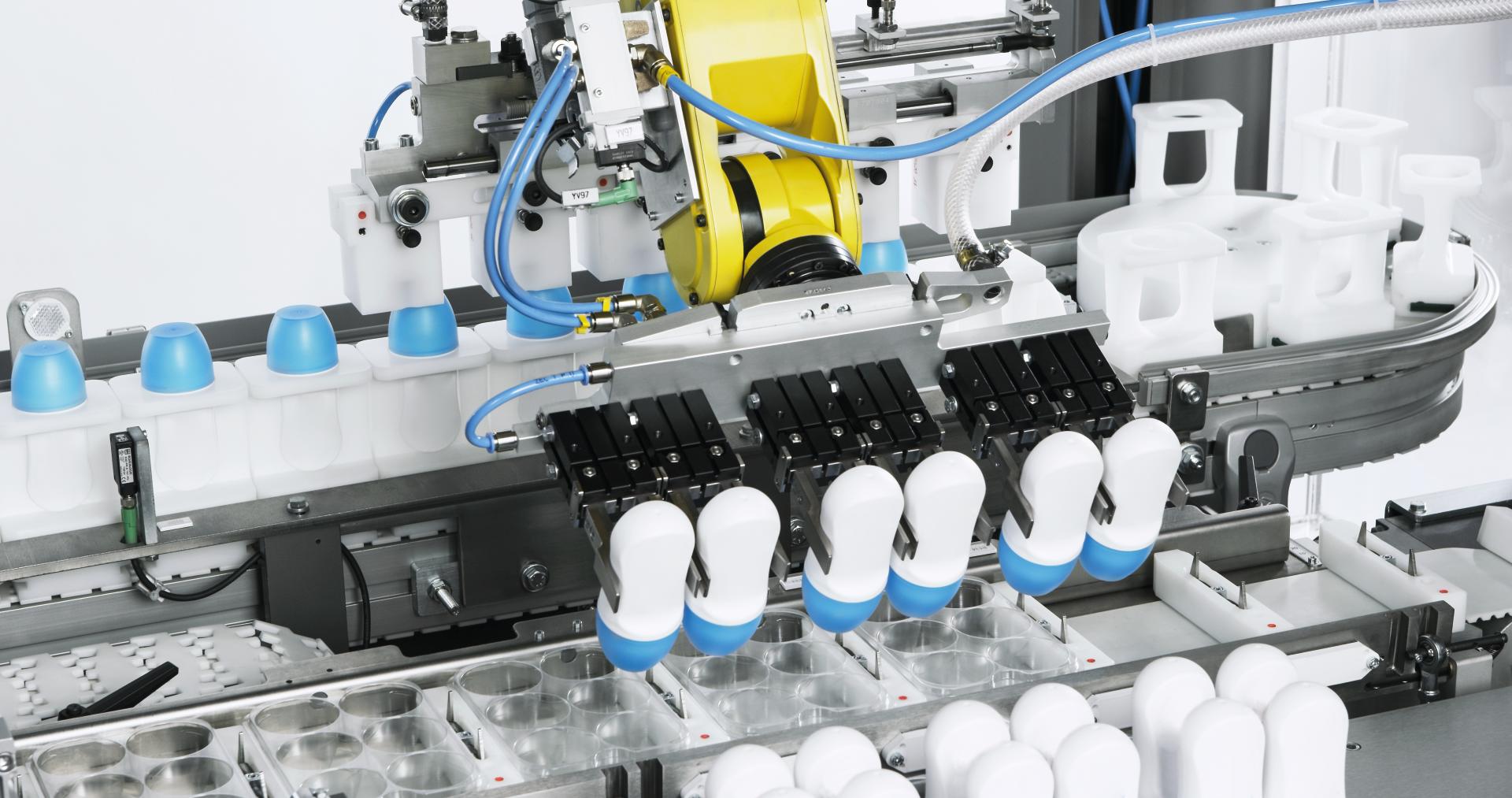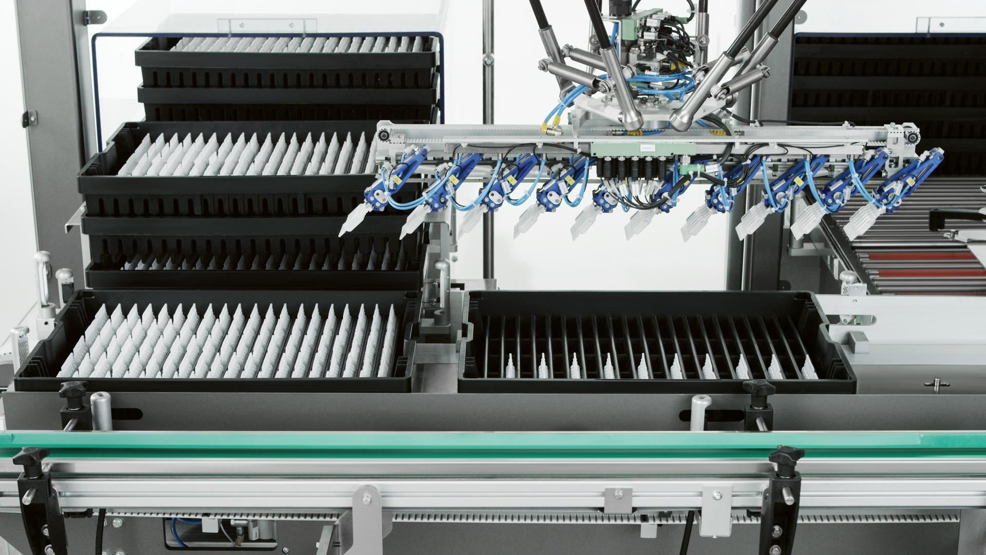 Our robotic manipulation systems are engineered to manage a wide range of sensitive pharmaceutical items, including medical devices, pens, BFS containers, vials, ampoules, and syringes. Integrated at different stages of a packaging line, our feeding systems and technologies ensure orderly manipulation of products in bulk format, taking them from trays and feeding them into the line, placing them on trays to remove them from the line or creating a buffer during line stoppages. Robotics enable precise loading and unloading from transport trays, as well as insertion or removal of products with no risk of contamination or damage. In configurations where the tray is an integral part of the packaging, robotized units carefully transfer products, such as tubes or bottles, from pucks into display trays, ensuring secure positioning and alignment.