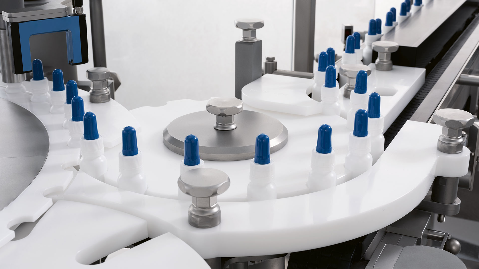 IMA Life closing machine handle up to 30 packaging types on one unique machine which can apply screw or pressure caps, alu-PFP caps, screw or snap-on nasal spray pumps with or without dip tube; can handle all types of innovative eye drop packaging.